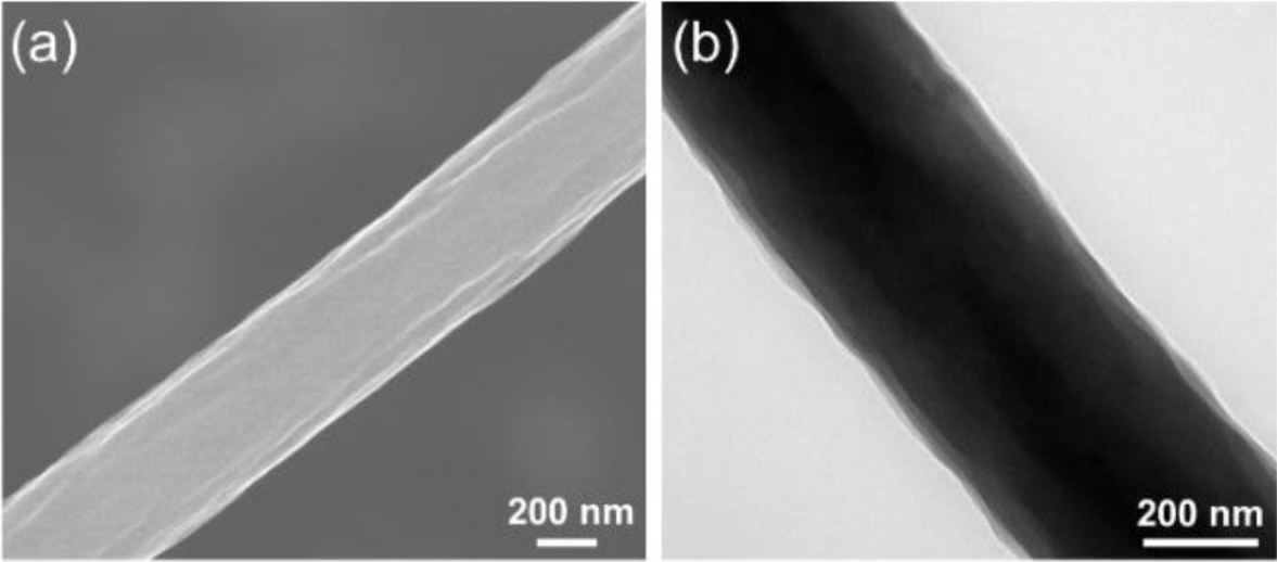 Figure 4 (a) SEM; (b) TEM images of the carbonized pristine PAN nanofiber. |