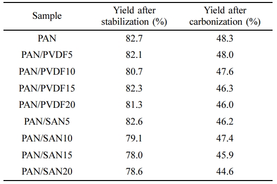 In the preparation of the carbon nanofibers, the oxidative stabilization process is an essential stage prior to the carbonization to increase the carbon yield of the PAN fiber. This step includes cyclization of the linear structure which leads to formation of more stable ladder structure.30 The ladder structured PAN fiber can endure in high carbonization temperature without being decomposed. The diameter of the fibers decreases due to the structural change, along with the weight loss caused by the dehydrogenation. The weight yield of the stabilized and carbonized PAN-based nanofibers is summarized in Table 3. The final carbon yield of the neat PAN and blended nanofibers is in the range of 40-50%.