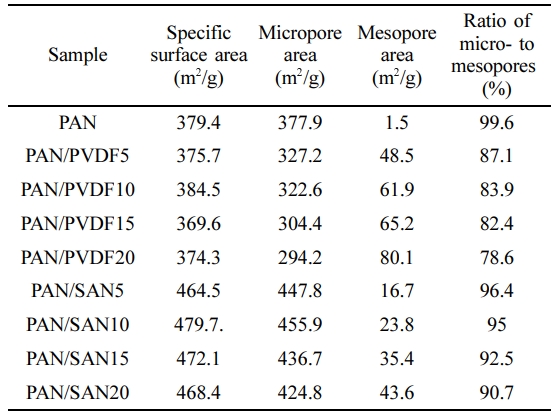 In the case of the PAN/PVDF blend systems, the specific surface area is almost unchanged but the fraction of the mesopores is significantly increased. The ratio of micro- to mesopores is sharply reduced by incorporating the 5 wt% PVDF from 99.6% to 87.1%, and then decreases gradually to 78.6% at 20 wt% PVDF. This result reveals that the elongated internal pores are acted as the mesopores. In case of the PAN/SAN blend systems, however, the specific surface area is noticeably increased compared to the neat carbon nanofibers. The increased surface area results from the increased areal fraction of the micropores. Consequently, the round- or oval-shaped pores contribute significantly to the evolution of the micropores.