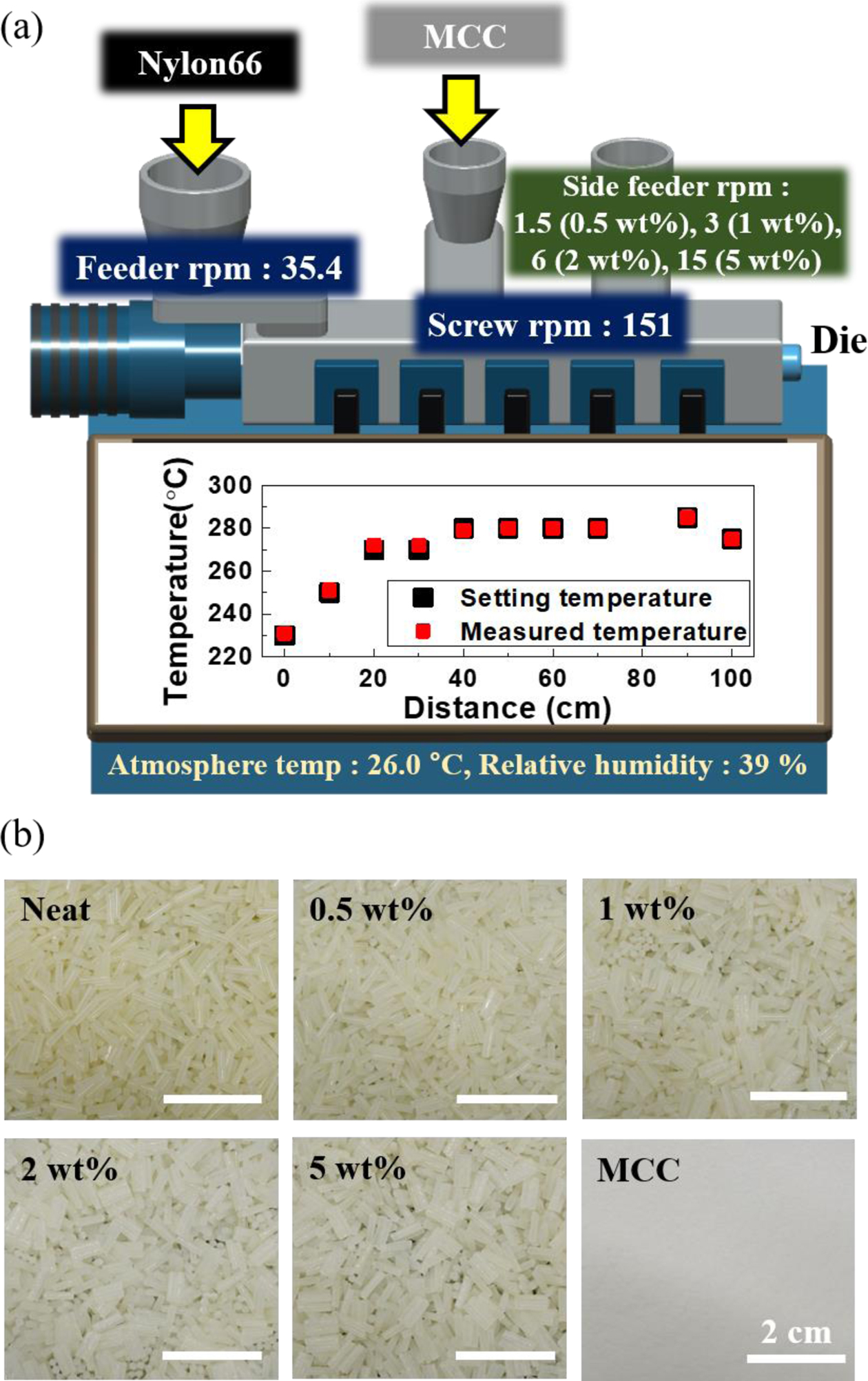 이번 실험에서 사용한 압출기는 맞물려 있는 스크류 두 개가 동일한 방향으로 돌아가는 co-rotating 방식이며 스크류의 직경은 25 mm이다. 나일론66 복합체 제작에 사용된 압출기 온도 조건은 호퍼부터 다이까지 섭씨온도 단위로 231-251-272-272-279-280-280-280-285-275이며 실제 온도는 230-250-270-270-280-280-280-280-285-275로 확인됐다. 실험에 사용된 나일론66의 경우 약 230 °C부터 용융이 시작되기 때문에 나일론66의 형상을 어느정도 유지시키고 최종적으로 펠렛 형태의 복합체를 얻기 위해 마지막 설정온도를 낮게 설정했다.16 메인 스크루 속도는 151 rpm, 피더 속도는 35.4 rpm으로 고정했으며 설정한 속도 이상에서는 melt fracture나 die swell현상을 보였기 때문에 이러한 현상을 해결할 수 있는 가장 적절한 속도로 설정하였다. 사이드 스크루의 속도는 1.5, 3, 6, 15 rpm으로 각각 MCC의 중량비율이 0.5, 1, 2, 5 wt%의 복합체를 생산하는 조건순이다. 각각 조건에 따라 neat 나일론66부터 5 wt% MCC까지 총 5가지의 복합체를 제조했다. 위 과정을 통해 압출된 나일론66 복합체는 펠렛타이저를 이용하여 펠렛 형태로 제조했다.
