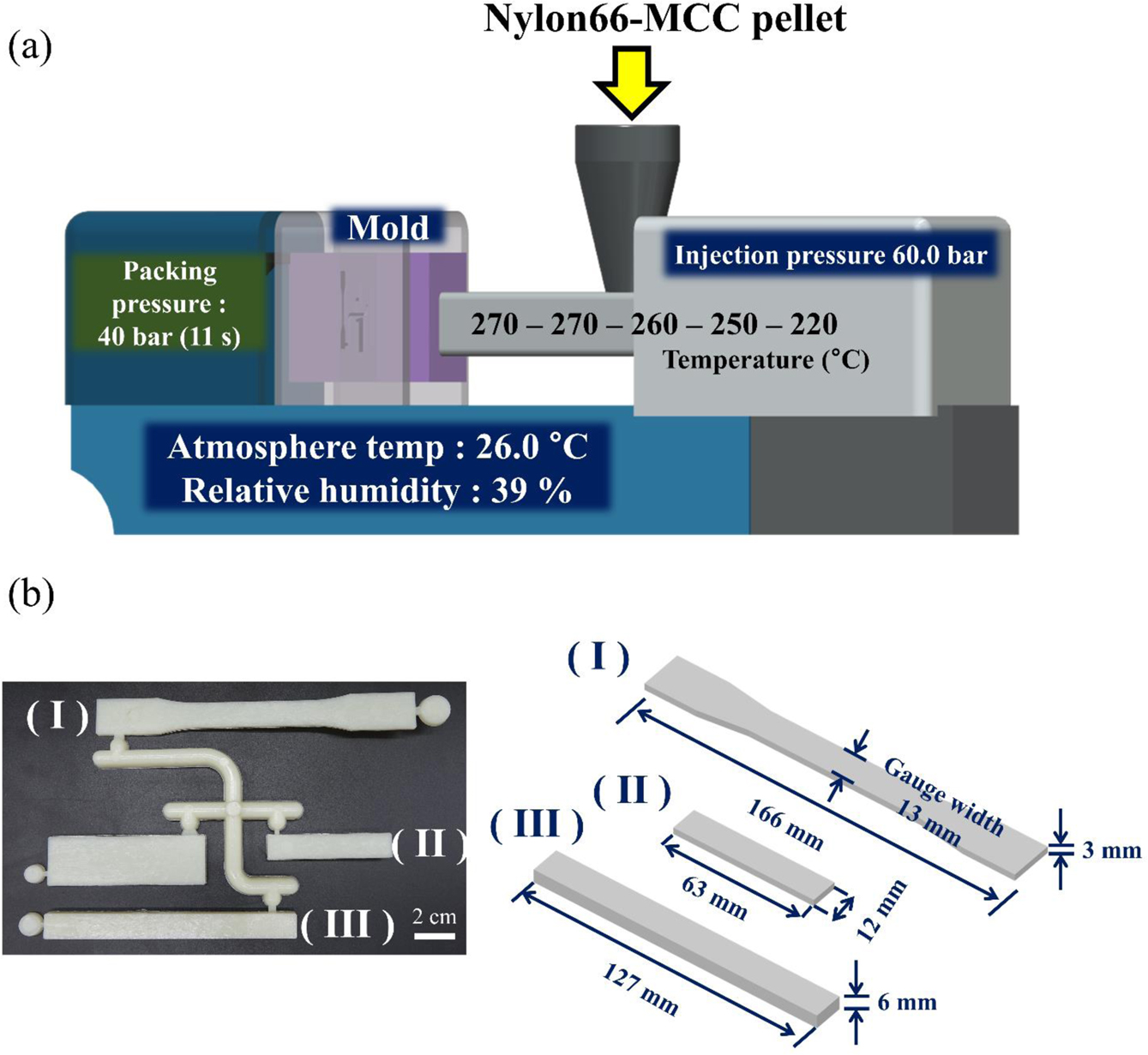 Injection process of nylon66/MCC composites: (a) Schematic diagram of the injection molding process and injection molding conditions including packing pressure, injection pressure and injection temperature; (b) photographs of injection molded specimen for (I) tensile tests, (II) impact tests, and (III) flexural tests.