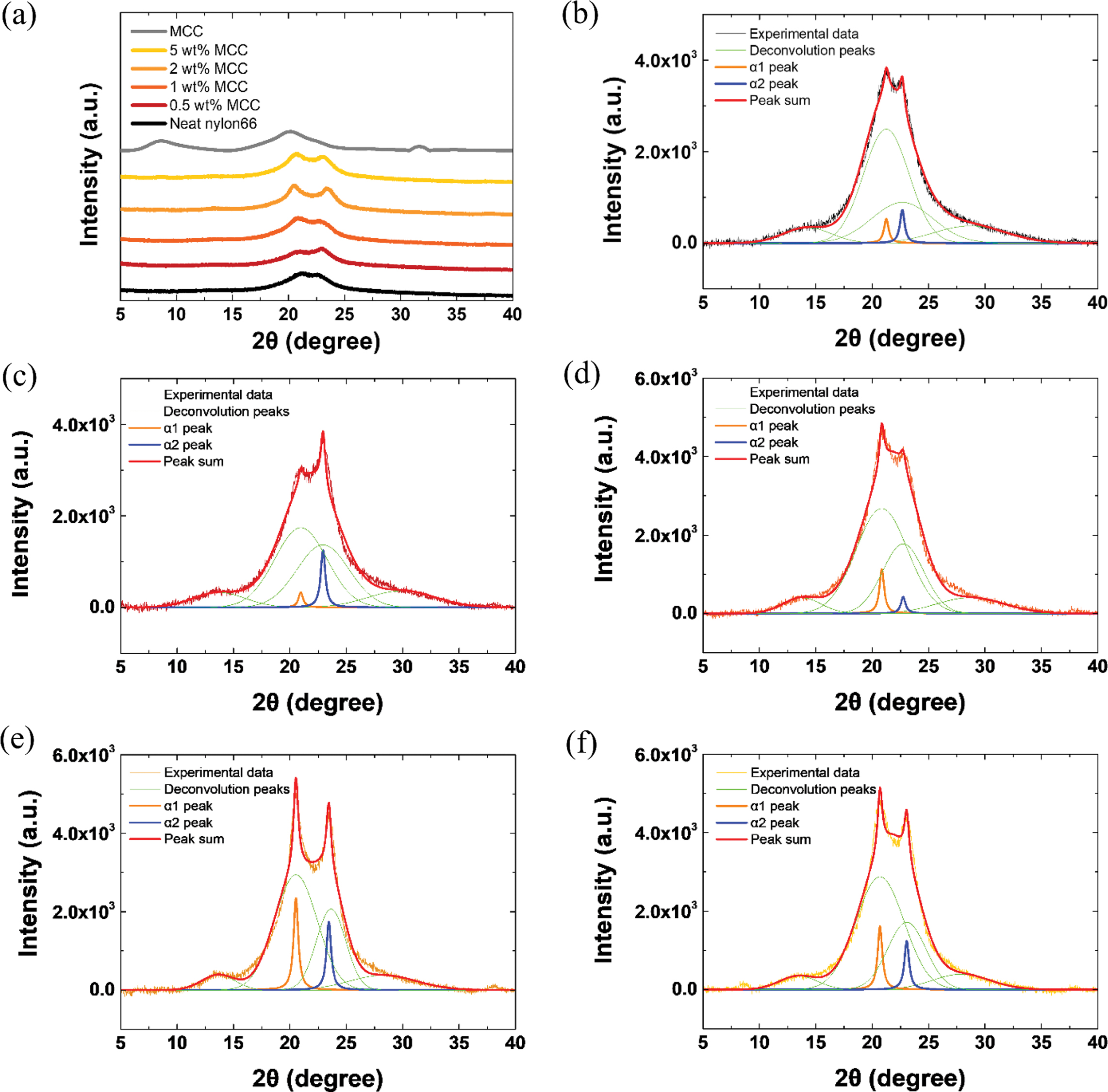 XRD analysis: (a) XRD patterns of composites at different MCC concentrations; (b) neat nylon66 deconvolution peak; (c) 0.5 wt% MCC deconvolution peak; (d) 1 wt% MCC deconvolution peak; (e) 2 wt% MCC deconvolution peak; (f) 5wt% MCC deconvolution peak