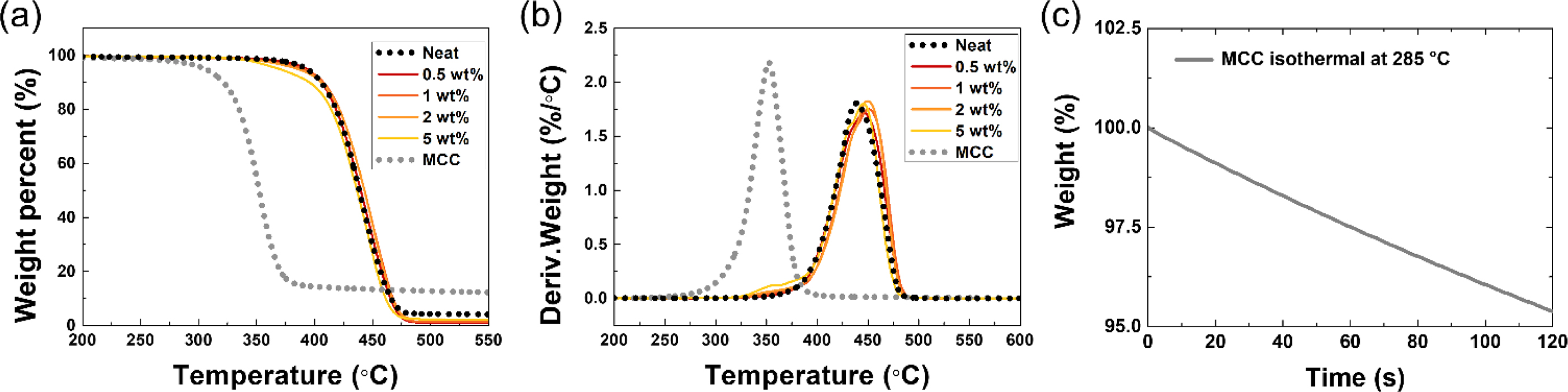 TGA thermograms of neat nylon66, nylon66/MCC composites, and MCC: (a) weight loss curves; (b) the derivative thermogravimetric curves; (c) isothermal curves.