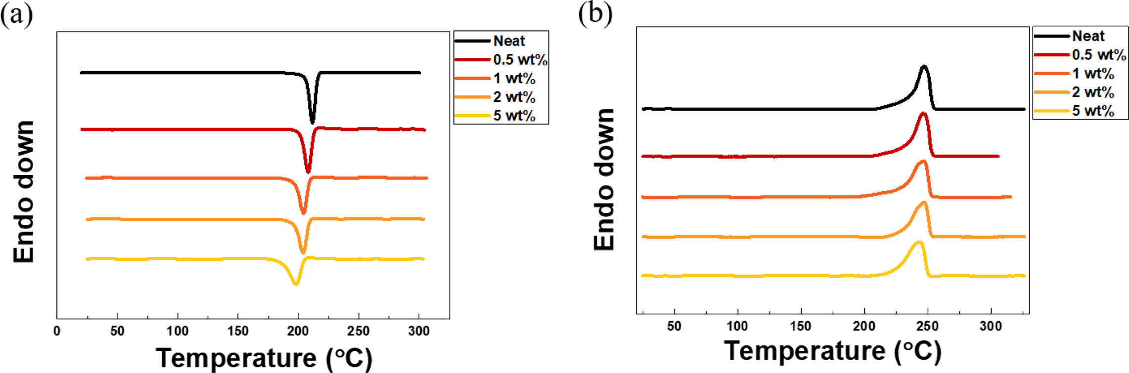 DSC endothermal curves of neat nylon66, nylon66/MCC composites measured at 10 °C/min heating and cooling rate: (a) heating scan to measure melting temperature of the composites; (b) cooling scan to measure crystallization temperature of the composites.