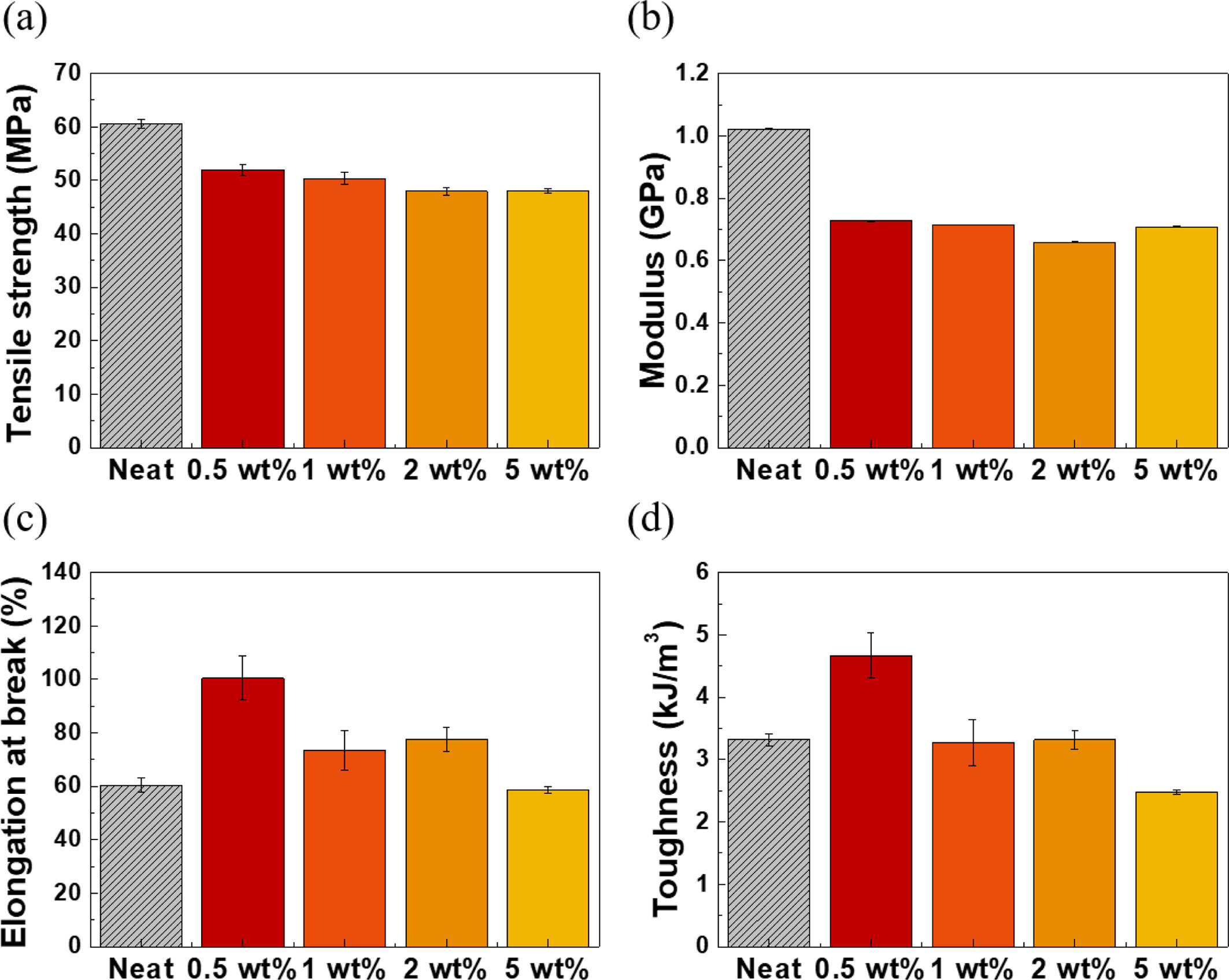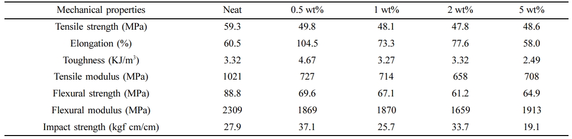 물성 측정 시험 결과. UTM 인장강도 측정을 통해 응력-변형도 곡선을 얻을 수 있었다. 이러한 곡선에서 우리는 인장강도(tensile strength), 인장 모듈러스(tensile modulus), 연신율(elongation), 인성(toughness)을 구했다. Figure 7 및 Table 3에서 나타낸 바와 같이 보강재의 함량이 증가할수록 인장강도는 감소하는 경향을 보였다. Neat 나일론66은 59.3 MPa, 0.5 wt% MCC는 49.8 MPa, 1 wt% MCC는 48.1 MPa, 2 wt% MCC는 47.8 MPa, 5 wt% MCC는 48.6 MPa의 인장강도를 나타냈다. 이는 보강재의 첨가가 고분자 결정성에 영향을 주어 나타나는 현상으로 판단되며 이는 DSC에서 확인할 수 있다. 인장강도의 감소폭이 10 MPa 이후로는 크지 않고 일정하기 때문에 보강재의 함량 증가에 따른 인장강도 감소는 차이가 크지 않을 것으로 해석 가능하다. 인장 모듈러스의 경우도 인장강도와 동일한 해석이 가능하다. 보강재의 함량이 증가할수록 인장 모듈러스는 감소하는 경향을 보이지만, 인장 모듈러스의 감소폭은 크지 않은 것을 확인할 수 있다. Neat 나일론66은 1.02 GPa, 0.5 wt% MCC는 0.73 GPa, 1 wt% MCC는 0.71 GPa, 2 wt% MCC는 0.66 GPa, 5 wt% MCC는 0.71 GPa의 인장 모듈러스 값을 나타내었다. 연신율은 0.5 wt% MCC에서 100% 이상으로 가장 높게 나타났다. Neat 나일론66에서는 60.5%, 0.5 wt% MCC에서는 104.5%, 1 wt% MCC에서는 73.3%, 2 wt% MCC에서는 77.6%, 5 wt% MCC에서는 58.0%의 연신율을 보였다. 인성의 경우도 연신율과 마찬가지로 0.5 wt% MCC에서 보강되는 것을 확인했다. 인성이란 복합체가 파단까지 받는 총 에너지의 합이므로 파단까지 견딜 수 있는 총 에너지의 합이 0.5 wt% MCC에서 증가했다. Neat 나일론66은 3.31 KJ/m3, 0.5 wt% MCC는 4.67 KJ/m3, 1 wt% MCC는 3.27 KJ/m3, 2 wt% MCC는 3.32 KJ/m3, 5 wt% MCC는 2.49 KJ/m3의 인성을 나타냈다.
