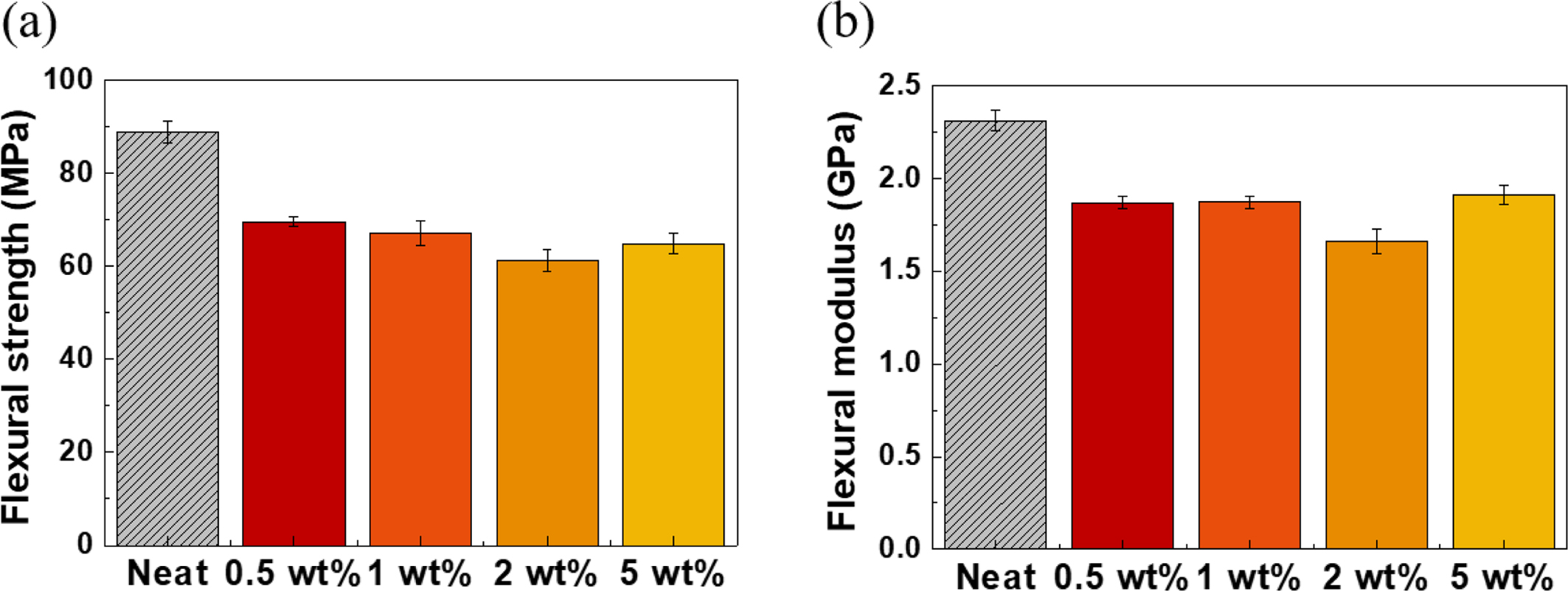 Flexural testing results for nylon66-MCC composites measured by UTM: (a) flexural strength; (b) flexural modulus. Error bars indicate standard deviation.