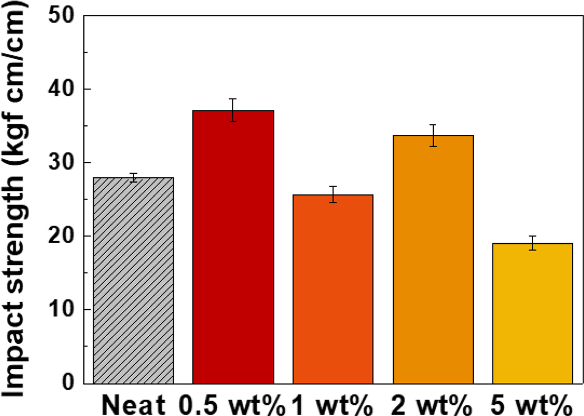 마찬가지로 굴곡강도 시험 후 Figure 8 및 Table 3에 응력-변형도 곡선을 도식화했고 이에 대해 굴곡강도, 굴곡탄성계수에 관한 분석을 진행했다. 굴곡강도, 굴곡탄성계수의 경우 인장강도와 동일한 경향을 보였다. Neat 나일론66 대비 굴곡강도와 굴곡탄성계수의 값이 감소하였지만 이는 보강재 첨가로 인한 결정성 감소 때문인 것으로 해석 가능하며 보강재의 함량에 따른 굴곡강도와 굴곡탄성계수의 감소폭 차이는 크지 않은 것을 확인했다. 각각 복합체의 굴곡강도 값은 neat 나일론66은 88.8 MPa, 0.5 wt% MCC는 69.6 MPa, 1 wt% MCC는 67.1 MPa, 2 wt% MCC는 61.2 MPa, 5 wt% MCC는 64.9 MPa를 나타냈다. 굴곡탄성계수는 neat 나일론66이 2.30 GPa, 0.5 wt% MCC가 1.87 GPa, 1 wt% MCC가 1.87 GPa, 2 wt% MCC가 1.66 GPa, 5 wt% MCC가 1.91 GPa를 보였다. 또한 Figure 9 및 Table 3에 나타낸 것처럼 복합체의 충격강도 시험 데이터를 비교 분석했다. 충격강도는 외부에서 짧은시간에 가해지는 충격에 대한 저항을 확인하는 시험이다. 결과적으로 0.5 wt% MCC 첨가했을 때 neat 나일론66 대비해서 충격강도가 증가하는 경향을 확인했다. 전체적으로 보강재의 함량이 증가함에 따라 보강재 간의 거리는 감소하게 되어 보강재 간에 작용하는 인력이 증가하여 MCC의 응집(aggregation)이 발생한다. 이러한 응집은 보강재와 고분자 간의 접착력(interfacial energy)보다 고분자-고분자 그리고 보강재-보강재 간의 응집력(cohesive energy)이 더 큰 상황에서 발생한다. MCC의 도입으로 유도했던 수소결합이 발생하여 0.5 wt% MCC에서 기계적 물성증가를 보였지만 1 wt% MCC 이상부터는 오히려 기계적 물성이 감소하는 경향을 보였다. 이는 MCC의 응집이 존재하는 부분에서는 구형의 보강재 상호 간의 응집력이 약하기 때문에 발생했다. 따라서 충격이 가해지는 상황에서는 MCC의 응집이 일어난 부분에서 크랙이 먼저 발생하게 되어 결함으로 작용하고 파괴가 일어나게 된다. 충격을 견디는 물성 값인 충격강도가 0.5 wt% MCC에서는 증가하였는데 1 wt% MCC에서는 감소함을 통해 확인할 수 있다. 흥미롭게도 2 wt% MCC에서는 충격강도가 증가하고 이후 5 wt% MCC에서 다시 감소하는 결과를 보였다. 이는 본래 존재하던 나일론66 간의 수소결합을 파괴하며 고분자-MCC 수소결합이 증가하기 때문에 이러한 증감을 보이는 것으로 해석했다. 충격강도의 값은 neat 나일론66이 27.9 kgf cm/cm, 0.5 wt% MCC가 37.1 kgf cm/cm, 1 wt% MCC가 25.7 kgf cm/cm, 2 wt% MCC가 33.7 kgf cm/cm, 5 wt% MCC가 19.1 kgf cm/cm로 측정됐다.