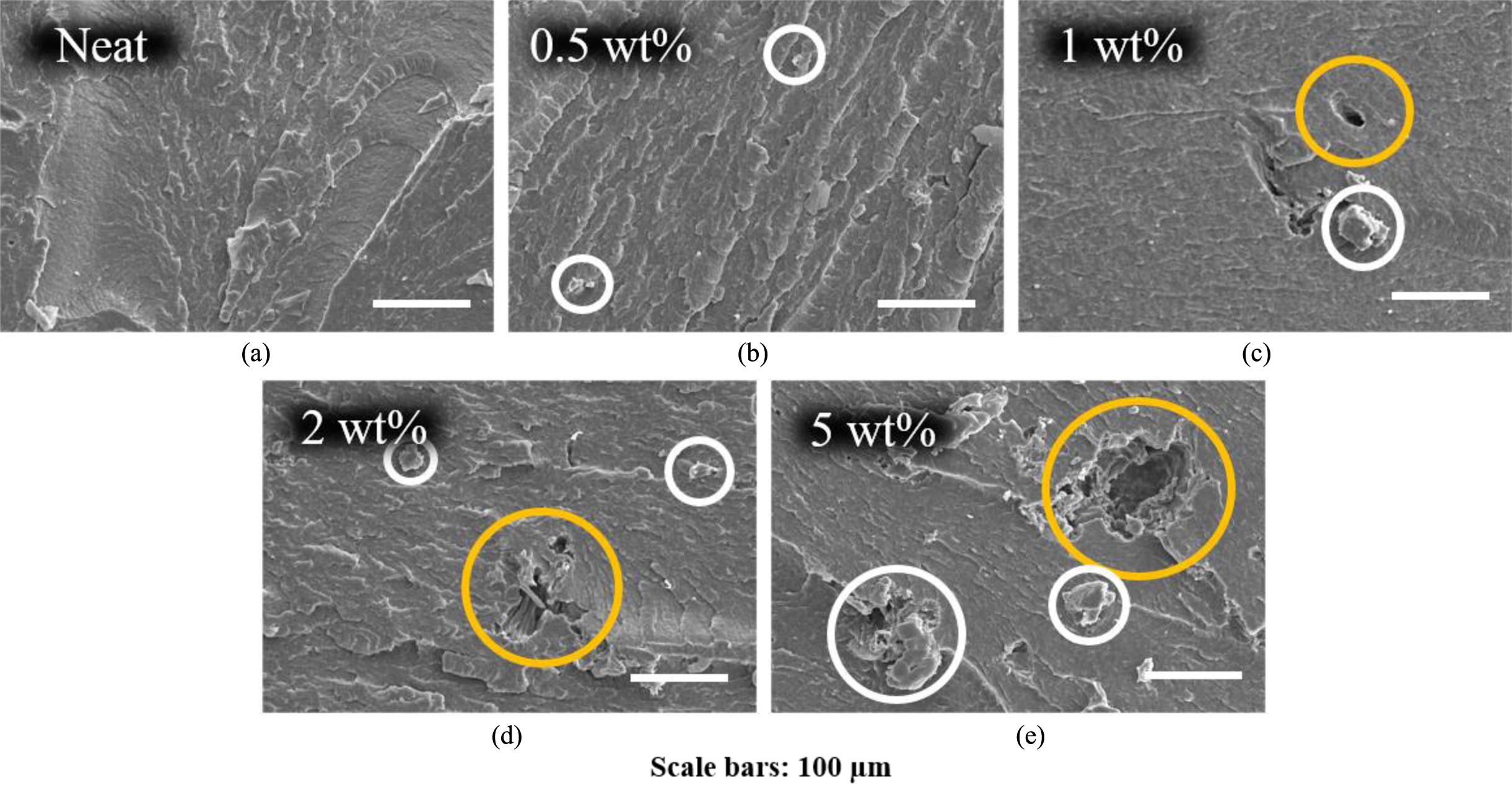 Fracture SEM micrographs. The nylon66-MCC composites at different MCC concentrations: (a) neat; (b) 0.5 wt% MCC; (c) 1 wt% MCC; (d) 2 wt% MCC; (e) 5 wt% MCC. The orange circles and the white circles represent the pore and the aggregation of MCC, respectively