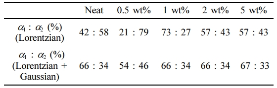 Figure 4(b)-(f)는 MCC함량별 XRD 데이터를 deconvolution한 것으로 α1, α2 피크는 Lorentzian 함수로 나머지는 Gaussian 함수로 도시하였다. Table 1에는 α1과 α2의 피크 면적과 비율을 Lorentzian 함수와 Gaussian 함수로 정리하였다. 0.5 wt% MCC의 경우 neat 나일론66이나 다른 MCC 함량비의 복합체와 달리 α1 피크가 급격히 감소하고 α2 피크가 증가함을 확인할 수 있다. 이로 인해 복합체를 만들 때 녹아서 반응하는 과정에서 MCC 보강재가 기존의 나일론66 사슬이 형성하는 수소결합 배열을 방해하여 새로운 수소결합, 즉 MCC와의 수소결합을 생성함을 확인할 수 있다. 0.5 wt% MCC보다 더 높은 함량비를 가지는 경우 MCC 보강재끼리 응집현상이 발생하여 나일론66 사슬과 수소결합을 효과적으로 하기 힘들기 때문에 피크가 neat 나일론66과 비슷한 경향성을 보여주는 것을 확인할 수 있다.
