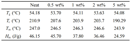 따라서 나일론66 매트릭스 자체의 결정화와 다양한 크기를 가진 MCC가 나일론66에 작용한 결정화가 발생하며 생성되는 결정의 크기가 다양해지기 때문에 결정화 피크가 MCC가 첨가되면서 넓어진 것으로 판단된다.