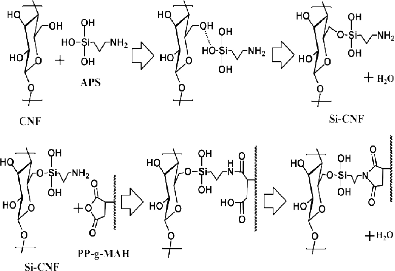 따라서 본 연구에서는 수분산 상태의 CNF의 표면의 수산기를 APS로 개질하여 실란 처리된 CNF(Si-CNF)를 제조하고, PP-g-MAH를 상용화제로 적용하여 PP/CNF 복합체를 제조한 후 CNF의 소수화, 복합체의 계면 특성 및 물성을 분석하여 실란 처리와 PP-g-MAH 처리가 물성에 미치는 영향을 고찰하고자 하였다.