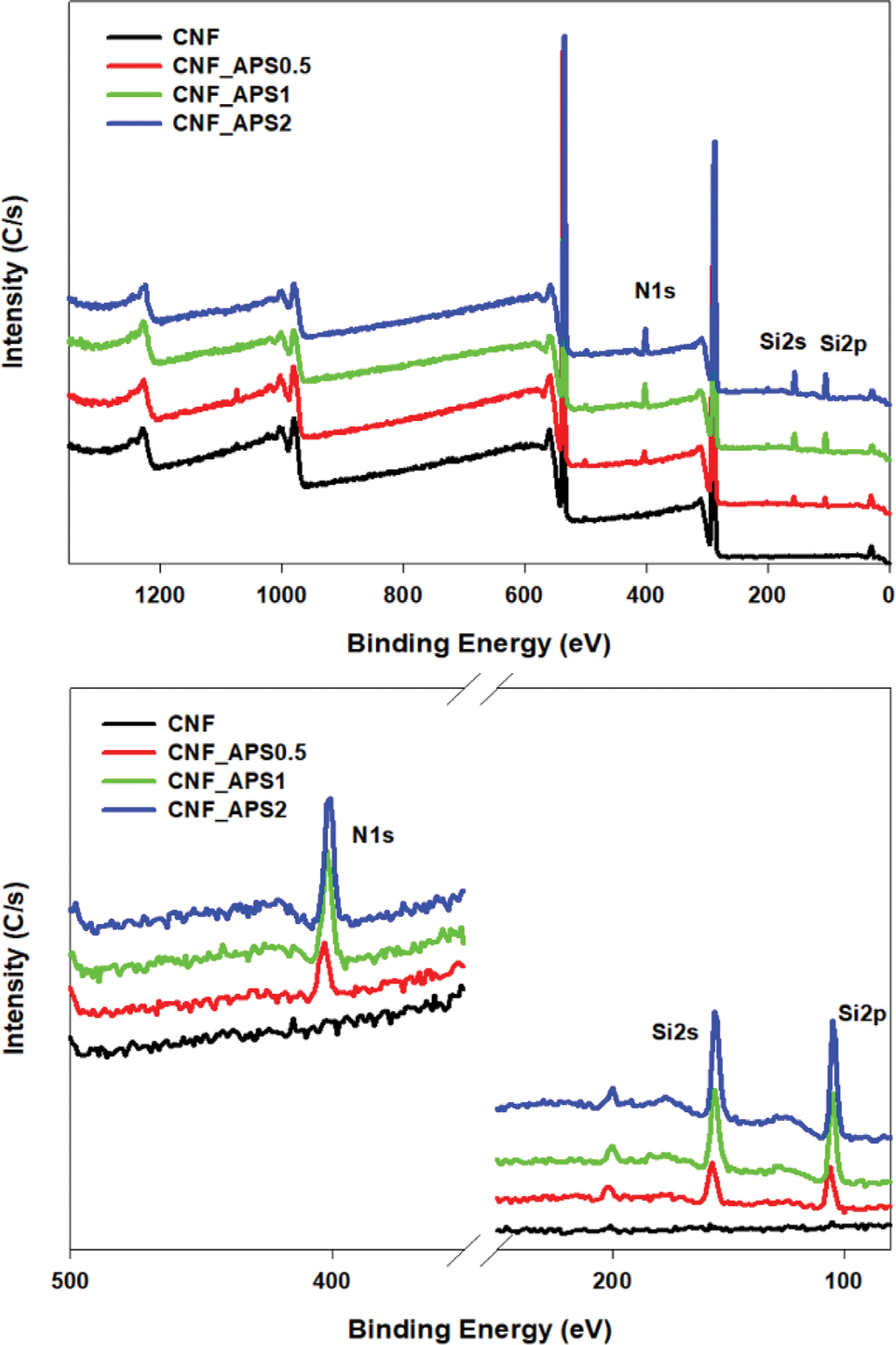 실란 처리된 CNF의 XPS 스펙트럼에서 CNF에는존재하지 않는 질소(N)와 규소(Si)가 400 eV 부근의 N1s 피크, 150 eV 부근의 Si2s 피크 그리고 100 eV 부근의 Si2p 피크들로부터 확인되었다.또한 APS의 함량의 증가함에 따라 이들 피크의 강도가 증가하는 결과로부터 CNF 표면에 실란 커플링제가 치환되었음을 간접적으로 확인할 수 있다.28,29