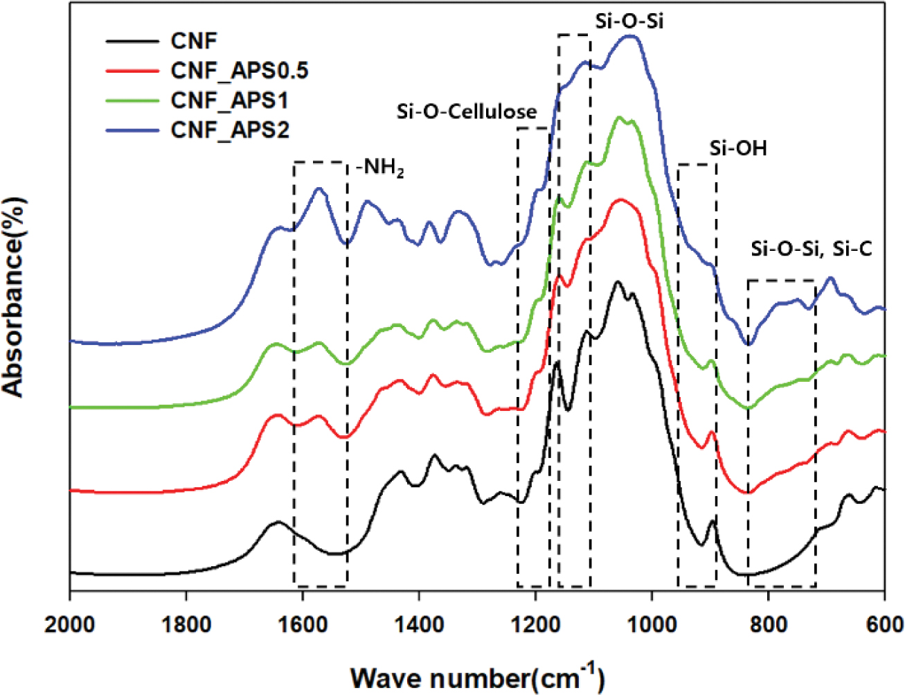 다음은 FTIR 스펙트럼에 대한 것으로 Abdelmouleh 등에24,30 의하면 실란 처리된 셀룰로오스에 열처리를 적용하면 1200 및 1135 cm-1 부근에서 Si-O-Cellulose와 Si-O-Si 신축진동이 나타나는 것으로 해석하였으며 925 cm-1에서 -OH 결합을 800-720 cm-1에서 Si-C와 Si-O-Si 결합 등을 포함하는 폴리실록산 졸의 기타 반응기가 나타나는 것을 확인하였다. 또한 1560 cm-1 부근에서 아미노기(-NH2)를 확인할 수 있었다.31 따라서 본 연구에서도 이들 피크의 존재와 강도 증가를 통하여 APS 함량의 증가에 따라 CNF 표면에 화학적으로 결합된 실란 커플링제의 양이 증가한 것을 확인할 수 있었다.