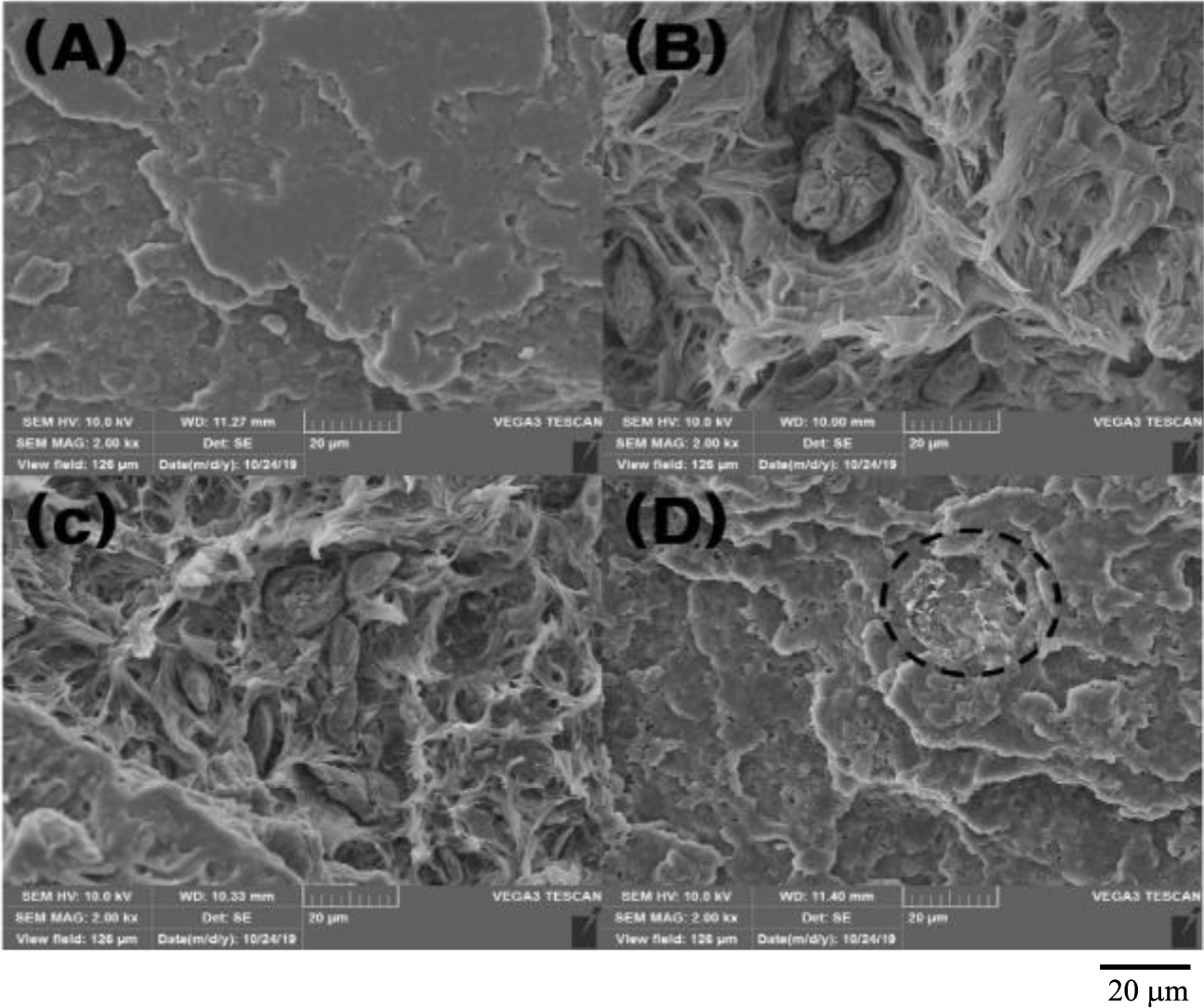 Figure 4 SEM images of PP/CNF composites (A) pure PP; (B) PP/ CNF10; (C) PP/CNF_APS1; (D) PP/CNF10/MB. |