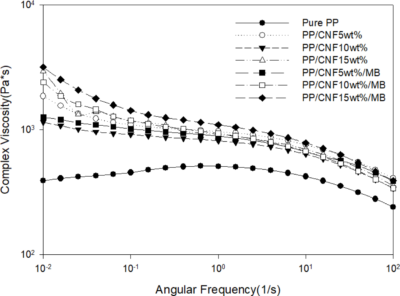 흐름성과 내열안정성이 PP 대비 상대적으로 열세한 CNF가 적용된 PP/CNF의 경우 자동차 내장재의 일반적인 사출온도인 200 oC 부근에서의 흐름성에 대한 평가가 중요하다. PP/CNF 복합체의 흐름 특성을 파악하기 위해 동적 유변 측정기를 이용하여 복소 점도를 측정한 결과를 Figure 7에 나타내었다. PP와 달리 PP/CNF 복합체에서는 낮은 주파수 영역에서는 CNF의 첨가에 따라 점도가 크게 증가하였지만, 주파수가 증가하면 점도가 감소하는 전단 유동화(shear thinning) 현상이 발생하기 때문에 실제 사출 가공영역인 10 Hz 이상의 영역대에서는 PP 대비 복소 점도 증가폭이 상당히 감소하는 결과를 확인할 수 있었다. 하지만, 높은 주파수 영역대에서도 PP 대비 PP/CNF 복합체가 높은 복소 점도를 보이기 때문에 사출 성형 시 이를 고려한 가공조건에 대한 조정은 필요할 것으로 판단된다.