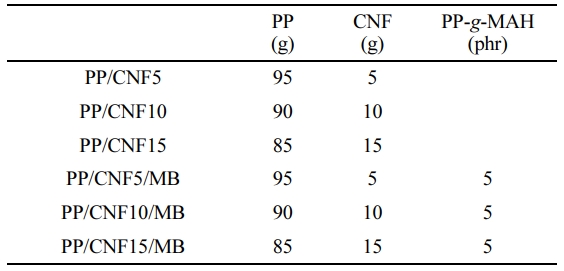 실험재료. PP는 대한유화공업(주)(한국)의 CB5290(melt index(MI) =100 g/10 min, 비중=0.91)과 SK종합화학(한국)의 BX3800(MI= 30 g/10 min, 비중=0.9)을 1:1 무게 비율로 혼합하여 사용하였다. CNF는 CNNT사(한국)의 1 wt% 슬러리 형태인 NS-L01(길이: 4~6 μm, 너비: 5~70 nm)를, 실란 커플링제는 Sigma Aldrich(USA)의 (3-aminopropyl)triethoxysilane (APS)를, PP-g-MAH의 경우 롯데화학(한국)의 CM1120H(MI= 100 g/10 min, 비중=0.91)를 사용하였다.