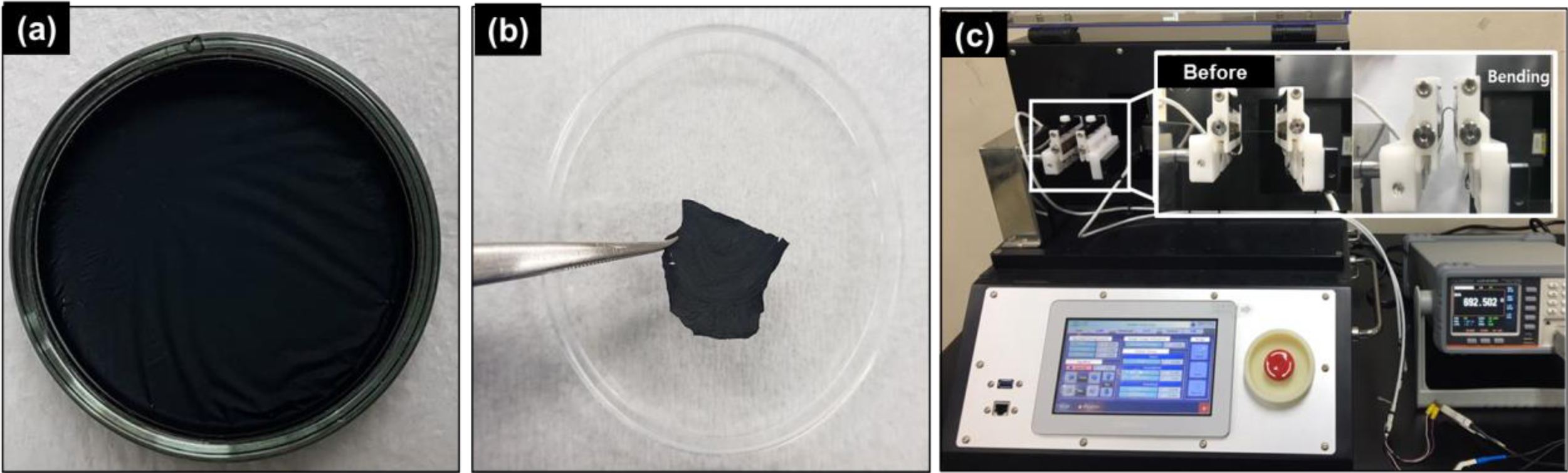 Measurement and Analysis. The resistivity of the films was measured by a multi-meter (HIOKI 3280-10F, Japan) in which silver paste was used as electrodes on both sides of the film. Bending tests were conducted to confirm the mechanical robustness of the free standing films using an in-house multipurpose flexibility test machine (IPEN Co., Korea). The morphologies of the surface and cross-section of the thin films were observed using field emission scanning electron microscope (FE-SEM) systems (TESCAN, MIRA LMH, Czech). The chemical composition of each surface for various free-standing film was analyzed using Energy-dispersive spectroscopy elemental mapping (EDS, Bruker AXS XFlash detector 5010, USA).