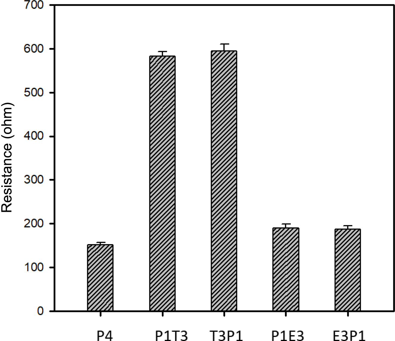The comparison of the relative resistances of the free-standing films prepared with different polymerization conditions is presented in Figure 2. The pristine PPy film (P4), which resulted from 4 h polymerization in the Py chamber, displayed the lowest resistance among the other films. With the incorporation of SiO2 in the Py matrix, such as P1T3 and T3P1, the resistance of the films was significantly increased by about three times. The reason for the increase in resistance for PT/TP series samples can be attributed to the existence of SiO2 polymerized from the TEOS chamber, and it is known that SiO2 is an electrically insulating material, a type of material that does not readily allow the flow of electrons in the polymer matrix. The polymerization order in the TEOS and Py chamber is not an important parameter, thus contributing to the slight increase in the resistance of the T3P1/P1T3 films. Therefore, merging an insulating domain to an electrically conductive polymer is the key factor in the sudden increase in resistance. Conversely, there was a discernible slight increase in the resistance for films under PE series, as represented by P1E3 and E3P1, in reference to pristine PPy film. This slight increase might be due to the contact resistance from the existence of interface between PEDOT and PPy domains. These kinds of hybrid could have potentials because it can be tunable bandgap of these two known highly conductive polymers, namely PEDOT and PPy. Reports revealed the PEDOT exhibits a bandgap of 1.6-1.7 eV29 while pristine PPy has a lower bandgap of 1.37 eV.30 These findings suggest that synergistic combinations of two or more different monomers can tune or control the electrical properties and other characteristics of the films depending on the requirements on certain applications.