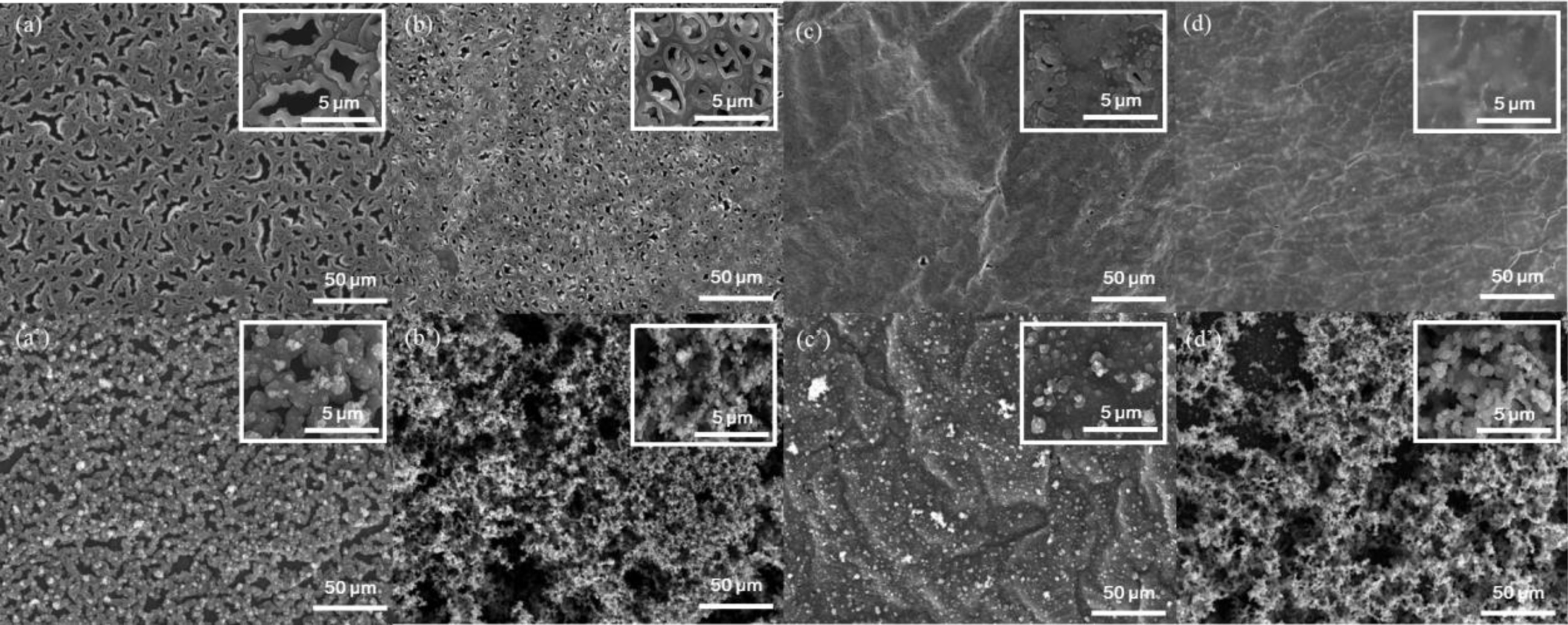 SEM images of various free-standing films, upside and downside respectively: (a and a') P1T3; (b and b') T3P1; (c and c') P1E3; (d and d') E3P1.