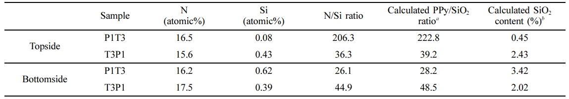 Relative Surface Compositions Top Side and Bottom Side of PPy and SiO2 in the Prepared Free-standing Film by means of EDS Analysis
