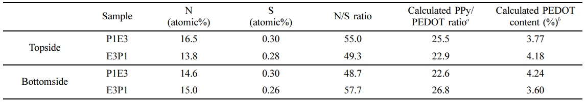 aCalculated PPy/PEDOT ratio = N/S ratio × (repeating unit mass of PPy/repeating unit mass of PEDOT repeating unit mass of PPy/repeating unit mass of PEDOT = 65 g (C4H2NH)/140 g (C6H4O2S) = 0.464). bCalculated PEDOT content (%) = [1/(1 + Calculated PPy/PEDOT ratio)] × 100.