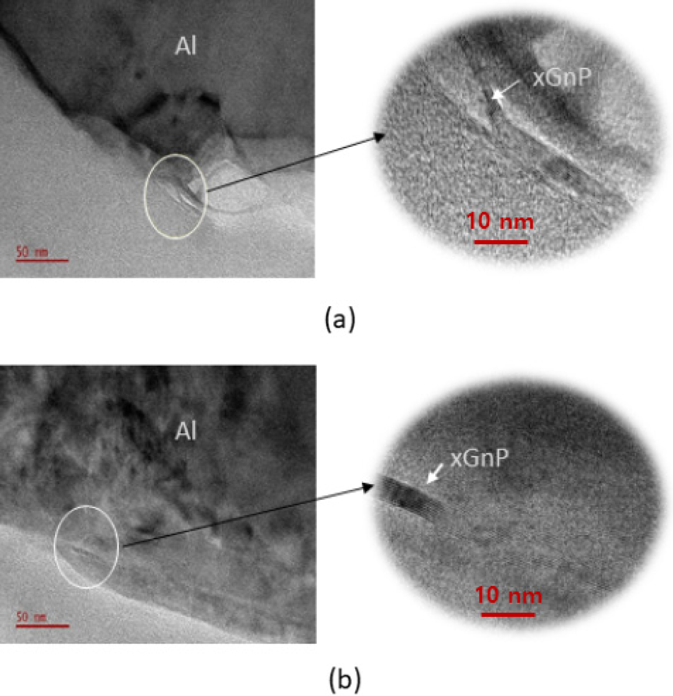 Two types of Al-xGnP hybrid powder were prepared, one is fully inserted xGnP and the other is partially inserted xGnP in Al-flakes. TEM images of hybrid powder showed the partially (a) and fully (b) inserted xGnP in Al-flakes.