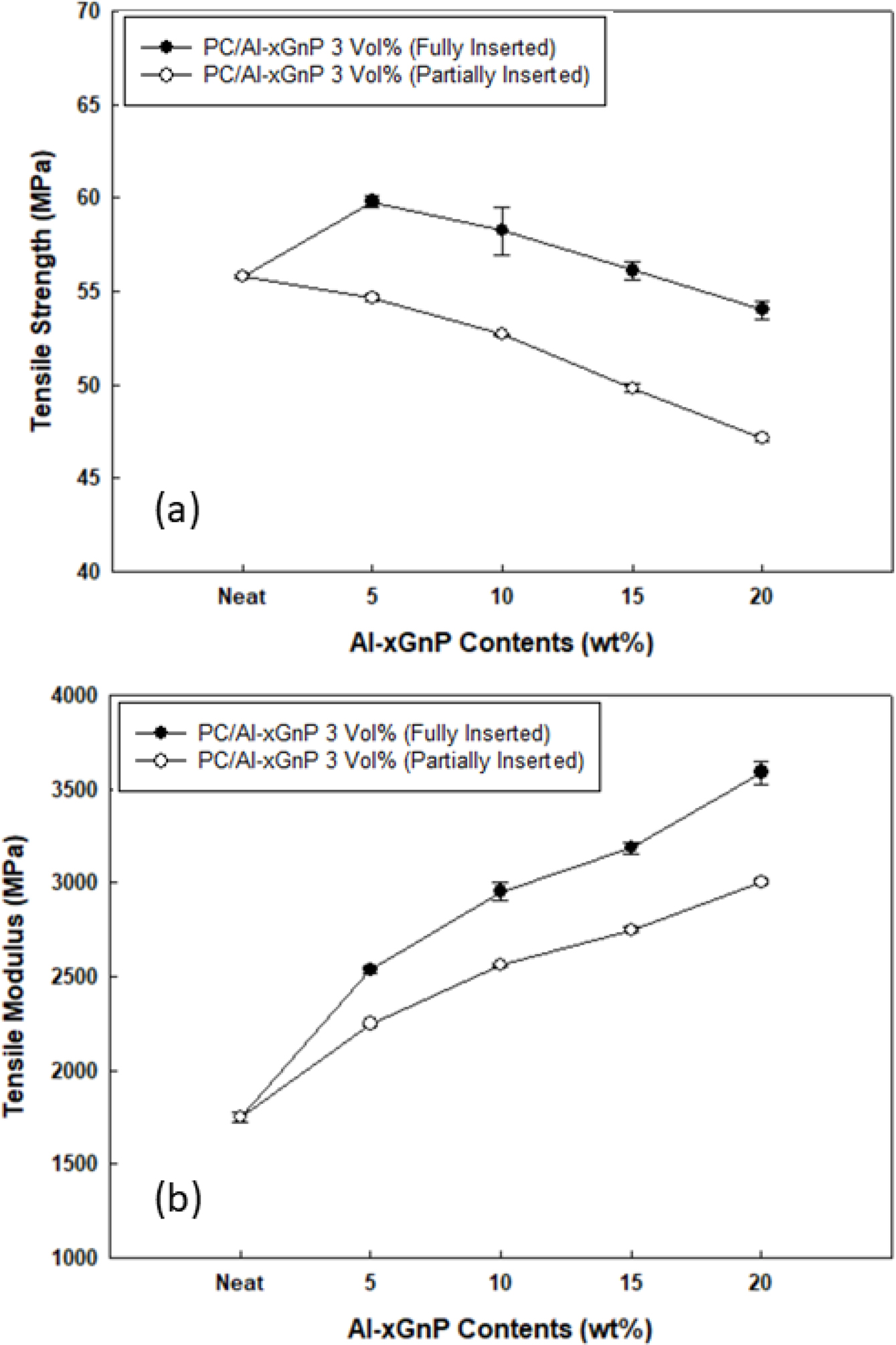 Figure 2 (a) Tensile strength; (b) tensile modulus of the PC/AlxGnP composites with the content of Al-xGnP. |