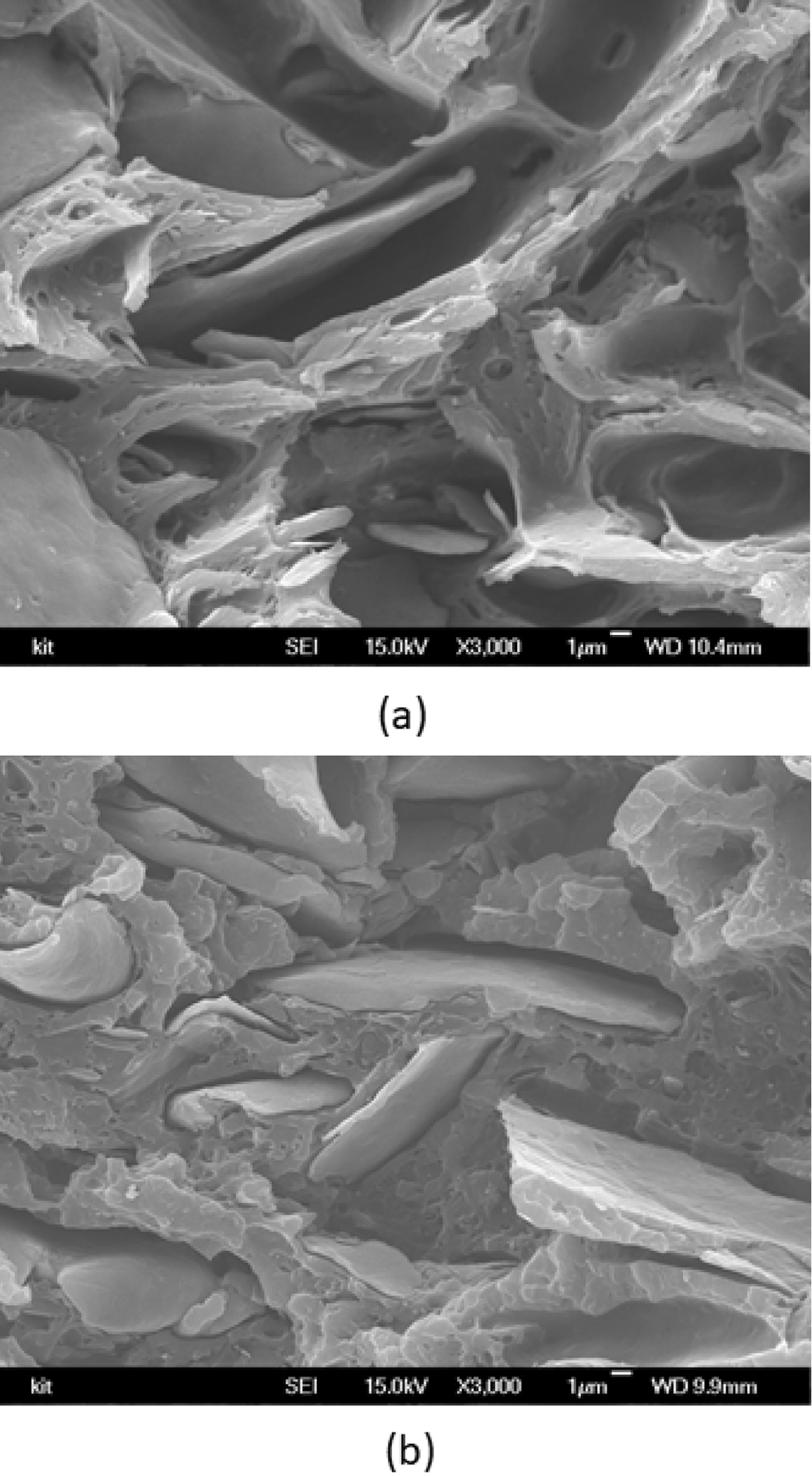 Figure 3 SEM images of (a) partially inserted; (b) fully inserted PC/Al-xGnP composites at loading of 20 wt% Al-xGnP. |