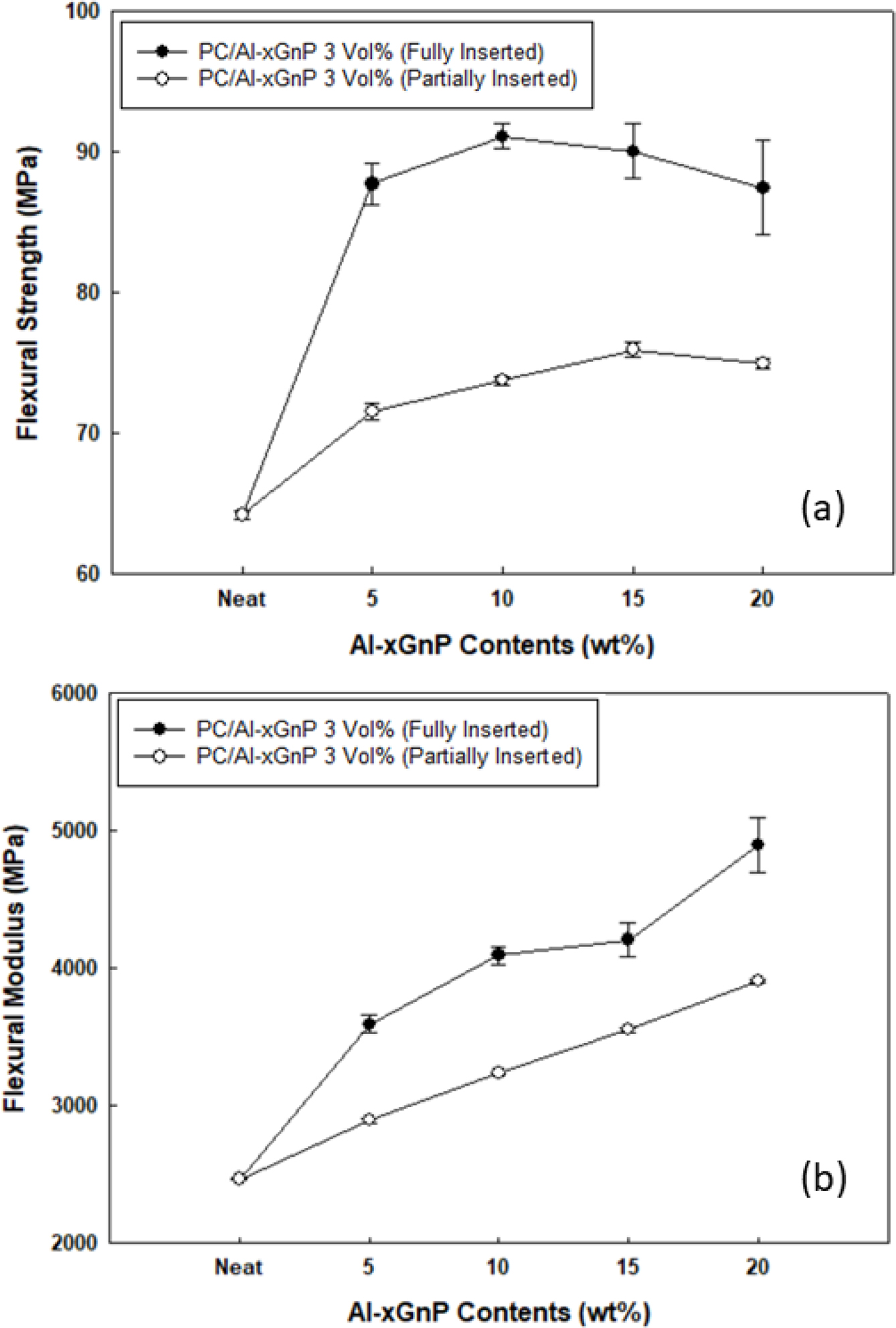 Figure 4 (a) Flexural strength; (b) flexural modulus of the PC/AlxGnP composites with the content of Al-xGnP. |