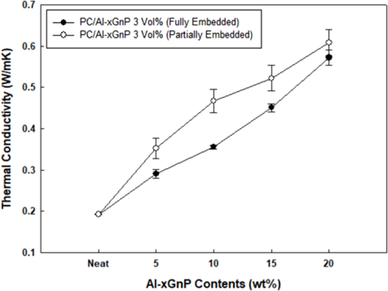 Polycarbonate/aluminum-exfoliated graphite nanoplatelets (PC/Al-xGnP) composites were prepared. Prior to the preparation of the composite, two types of Al-xGnP hybrid powder were prepared, one is fully inserted xGnP and the other is partially inserted xGnP in Al-flakes. TEM images of hybrid powder showed the partially and fully inserted xGnP in Al-flakes. The thermal conductivity of partially inserted PC/Al-xGnP composite was higher than that of fully inserted PC/Al-xGnP composite at the same filler concentration. On the other hand, the fully inserted PC/Al-xGnP composite was superior to the partially inserted PC/Al-xGnP composite in terms of mechanical properties.