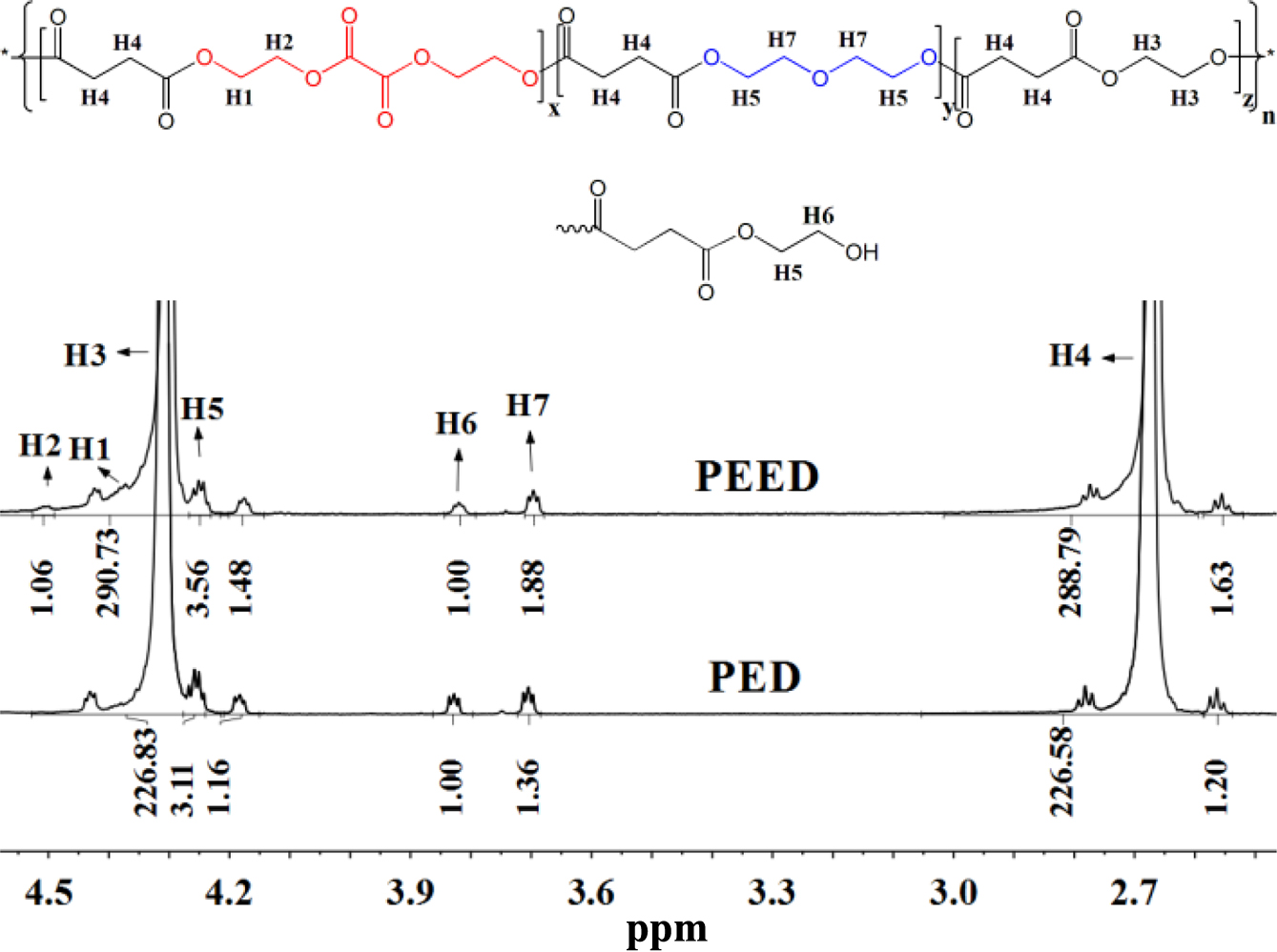 Chemical Structure and Molecular Weights of the Copolymers PED and PEED.1H NMR spectra can be used to accurately detect the chemical composition of products. Figure 1 showed the 1H NMR spectra of both samples and the signals had been assigned to the corresponding protons. The signals located at 4.30 and 2.67 ppm were ascribed to the protons of the ethyoxyl (H3) and the succinyl groups (H4), respectively. The proton (H6) signals of the terminal methylene groups are located at 3.82 ppm.