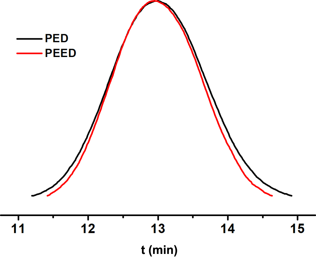 The degrees of polymerization and number average molecular weight (Mn) were calculated from the integrations of the ethyoxyl protons and the terminal methylene protons (Table 1). Meanwhile, molecular weights and polydispersity index of both PED and PEED were measured by GPC using DMF as the solvent (Figure 2). Perfectly, the number-average molecular weight obtained by the two methods was very similar.