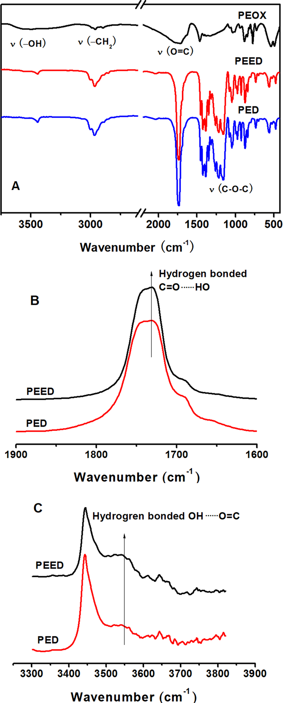 Figure 3 FTIR spectra of PEOX, PEED and PED polyesters (A) and comparison of FTIR spectra of PEED and PED at 1600~ 1900 cm-1 (B); 3200~3800 cm-1 (C). |