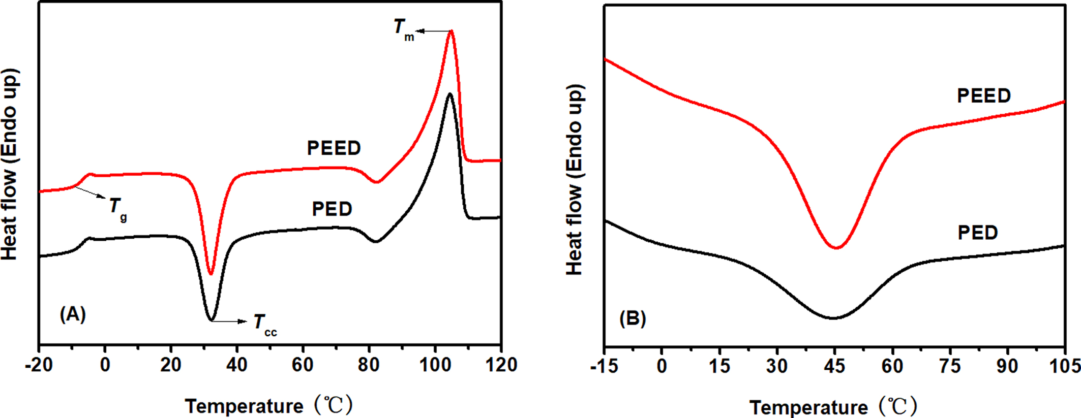 Figure 4 DSC heating scans (A); cooling scans (B) of PED and PEED samples at a scan rate of 10 °C/min |