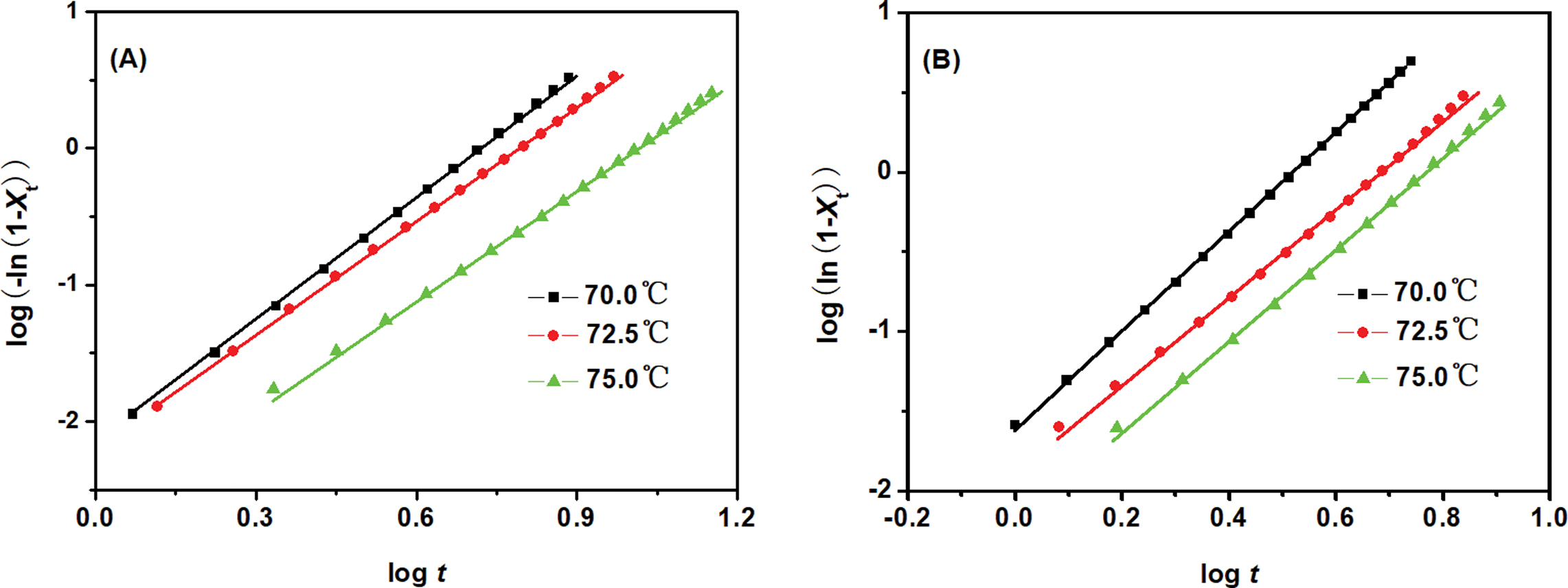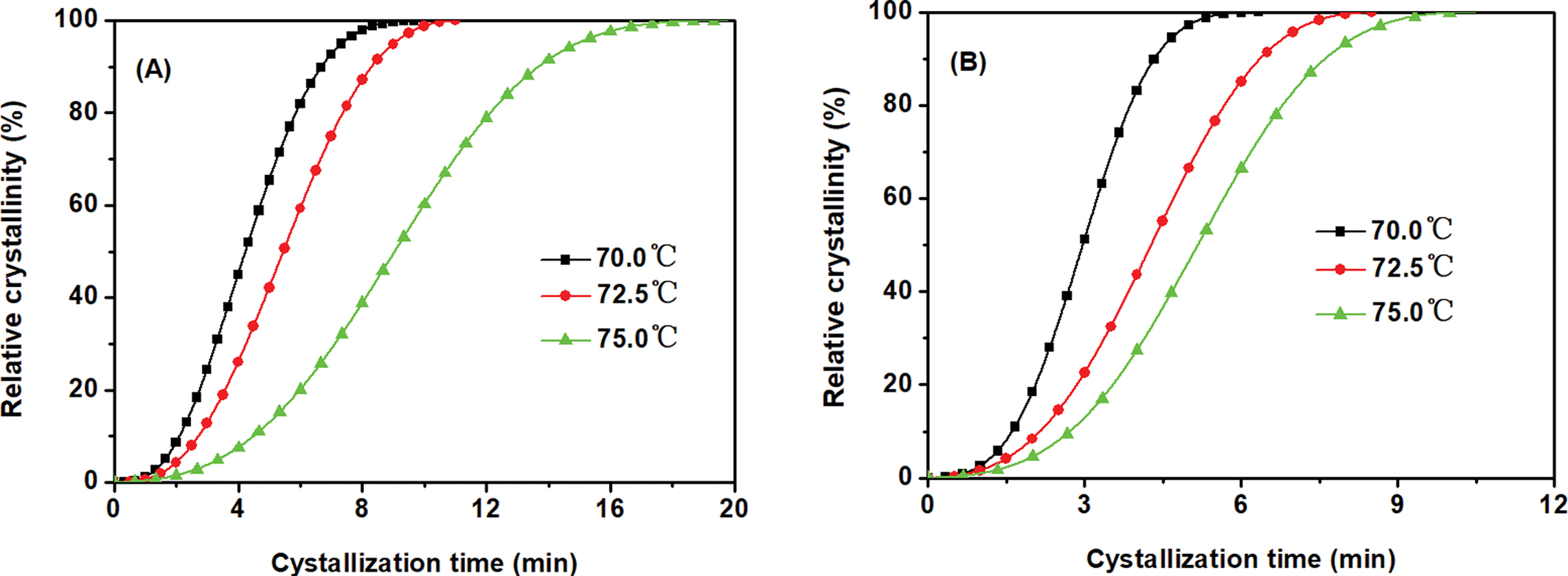 The above-acquired data of Xt and t were further analyzed by the Avrami equation to investigate the isothermal crystallization kinetics. The equation assumes that the relative crystallinity develops with crystallization time t as