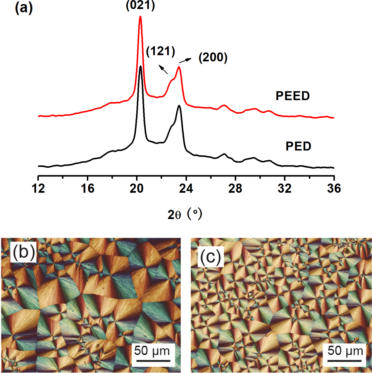 Figure 7 (a) WAXD profiles of PED and PEED; the spherulite morphologies of (b) PED; (c) PEED. |
