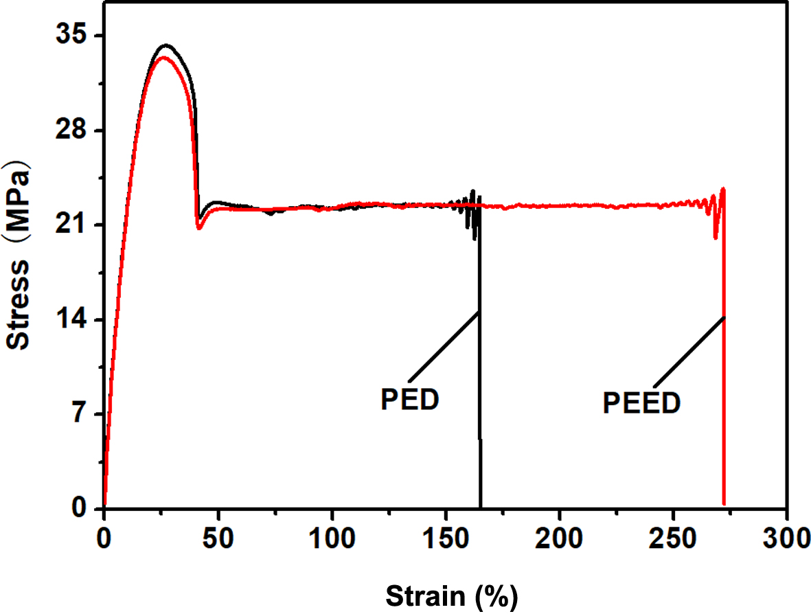 Mechanical Properties of the Copolymers. Figure 8 displayed the stress-strain curves of the copolymers. Both samples showed a ductile fracture. Table 4 summarized the values of their mechanical properties. PED and PEED both showed almost the same yield elongation (about 33%) and yield strength (about 33.5 MPa), indicating that a minor amount of EOX unit displayed no remarkable influence on yield behavior of PES segments. Yet, PED gave a tensile strength of 33.9 MPa, Young’s modulus of 305 MPa, elongation at break of 150% and 3880 MPa.m0.5 of fracture energy; PEED presented a tensile strength of 33.3 MPa, Young’s modulus of 340 MPa, elongation at break of 259% and 6235 MPa.m0.5 for fracture energy. Compared with PED, PEED exhibited improved elongation at break, Young’s modulus, and fracture energy due to its higher crystallinity but a smaller crystal size.However, tensile strength could be regarded as the same as that of PED.