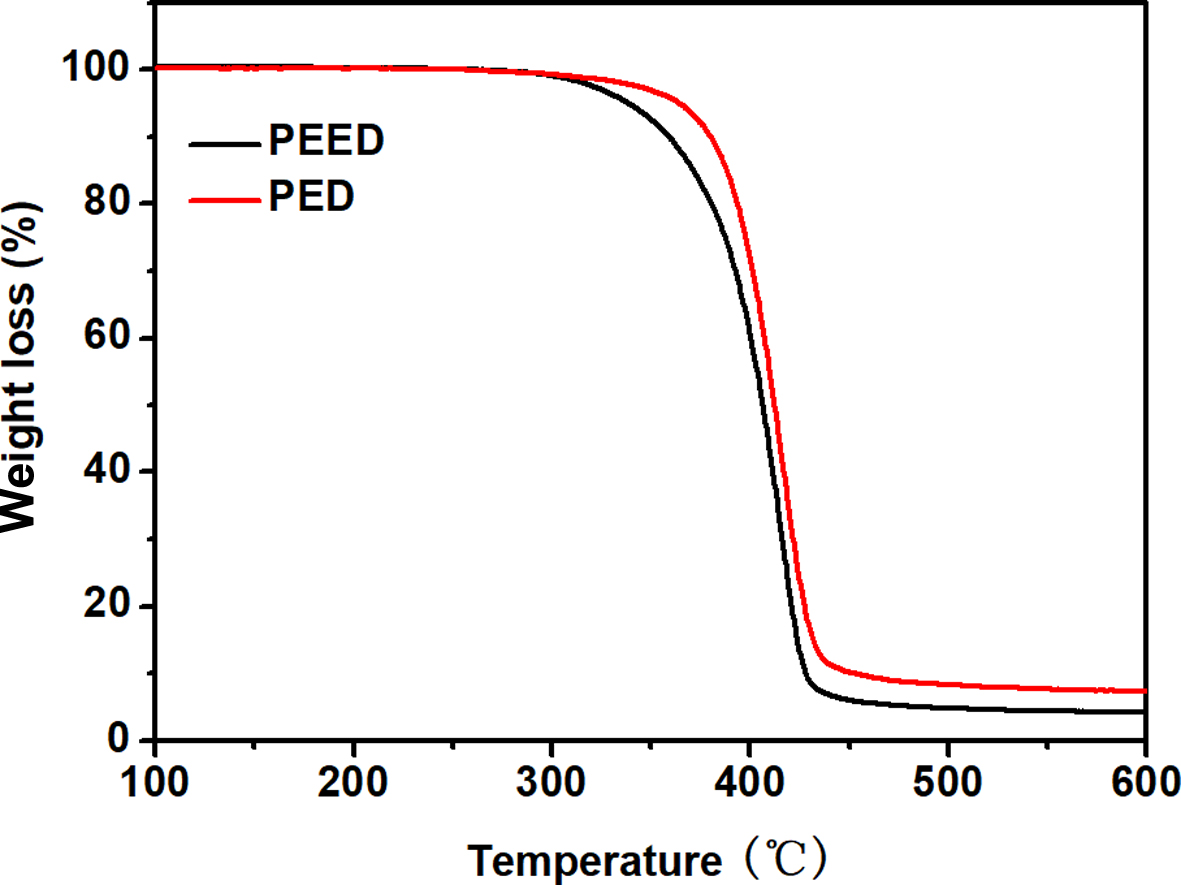 TGA Analysis. Figure 9 showed theTGA curves for PED and PEED. According to Figure 9, the values of T2% (temperature of decomposition 2% of sample weight) for PED and PEED were 340 oC and 310 oC, respectively, indicating that both PED and PEED had a good thermal stability. However, the thermal stability of PEED was lower than that of PED due to the lower thermal stability of EOX units.20