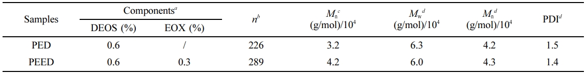 The 1H NMR spectra revealed that the molar percentage content of the DEOS unit in both PED and PEED was about 0.6%, and the molar percentage content of the EOX unit in PEED was about 0.3%.