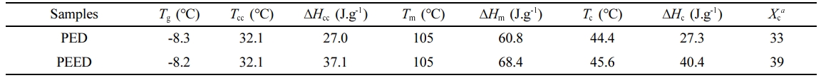 The WAXD patterns of both PES samples were displayed in Figure 7(a) after crystallizing at 80oC for three days.16 And their degrees of crystallinity (Xc) were listed in Table 3. PED and PEED presented almost the same three main diffraction peaks at 20.1°, 20.4°, and 23.2°, which corresponded to (021), (121), and (200) of PES, respectively.9,13 Therefore, both PED and PEED samples had the same crystal structures with PES, regardless of the EOX component. However, from Table 3, PED had a crystallinity of 33, while PEED had a crystallinity of 39, indicating that the EOX component could enhance the crystallinity of the PES copolymer.