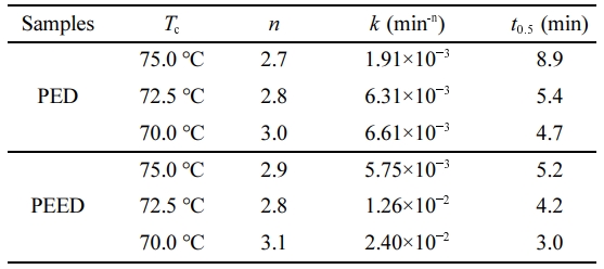 Taking the unit of k (min-n) and the different n values into account, the crystallization half-time (t0.5) values presenting the time for the samples to approach half of the final crystallinity were calculated by the following equation to compare the crystallization rates of PED and PEED. Table 3 listed t0.5 values of PED and PEED at various Tc. For both samples, a higher Tc led to a greater t0.5, indicating a slower crystallization rate. Furthermore, relative to PED, a shorter t0.5 for PEED was obtained at the same Tc, suggesting that PEED had a faster crystallization rate.