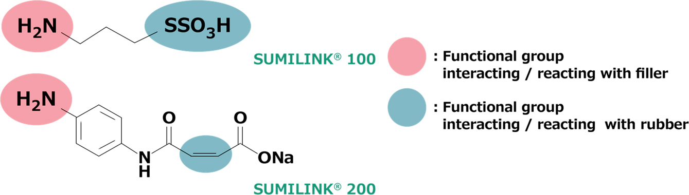 커플링제(coupling agent) 적용 및 가교조건 변경에 따른 미세먼지 경향을 분석하기 위해 커플링제 SUMILINK100과 SUMILINK200(Figure 1)을 적용하였고, 가교조건은 TBBS(N-tert-butyl-benzothiazole sulfonamide)를 감량하여 변경하였다. 커플링제는 고무 시편 가교 시 메인 고무(NR)와 필러(카본블랙) 사이의 상호작용을 높일 수 있도록 사용하였다.