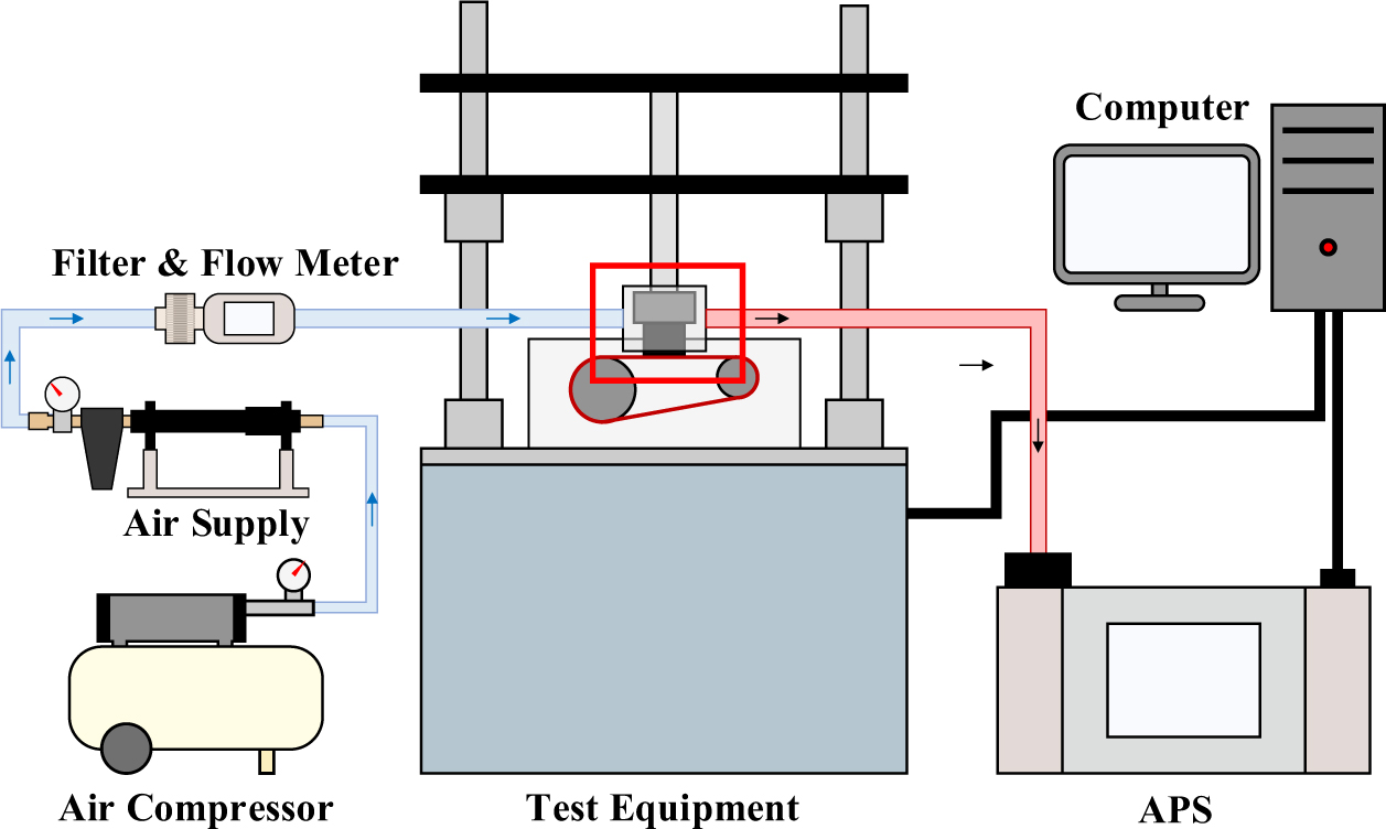 타이어 트레드 미세먼지 측정. 마모 실험기를 사용하는 실내 조건에서 외부 공기에 의한 간섭을 차단하기 위하여 본 연구에서는 에어필터(filtered air supply, TSI 3074B, USA)와 울파필터(ULPA)를 통해 수분 및 입자가 없는 깨끗하고 건조한 공기를 유량계(flow meter, TSI 5300, USA)로 측정하여 일정 유량(5 LPM) 챔버 내로 공급하였다.