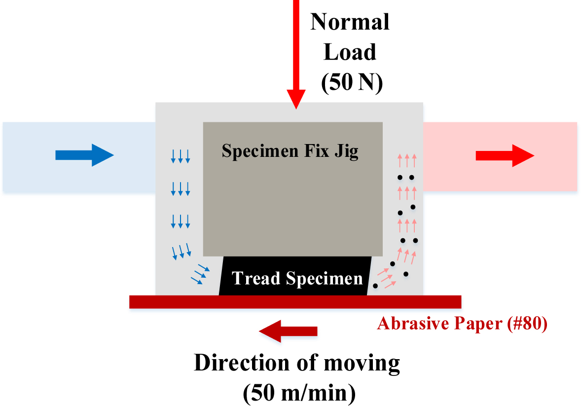 본 시험에서는 내마모성 향상에 따른 미세먼지 발생 경향을 분석하기 위해 앞서 처방에 따른 트레드 조각 시편의 마모 실험을 진행하였다. 시험 조건은 수직 하중 50 N, 속도 50 m/min을 진행하였고, 시험 모습 개략도를 Figure 3에 나타내었다.