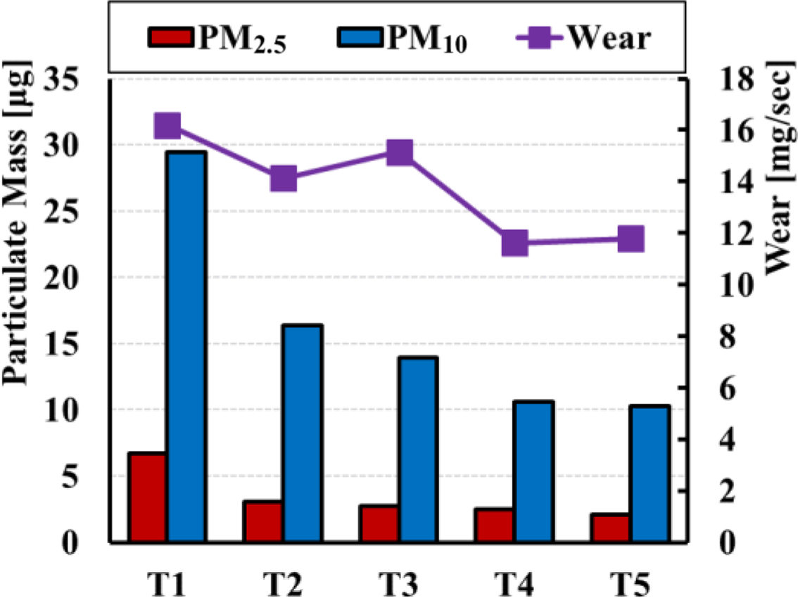 시험결과, 카본블랙 그레이드 변화에 따른 미세먼지 질량 농도 변화에는 뚜렷한 특징이 발생되지 않았다. 그러나 카본블랙 함량을 증가시켰을 때는 미세먼지 질량 및 마모량에서 감소하는 경향을 확인하였다. 함량을 증가하였을 때(T3→T5) PM2.5와 PM10은 약 26% 감소하였고, 마모량은 22% 감소하였다.