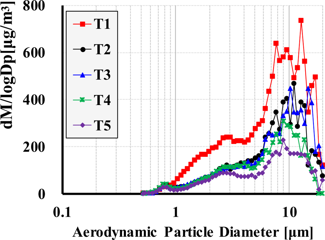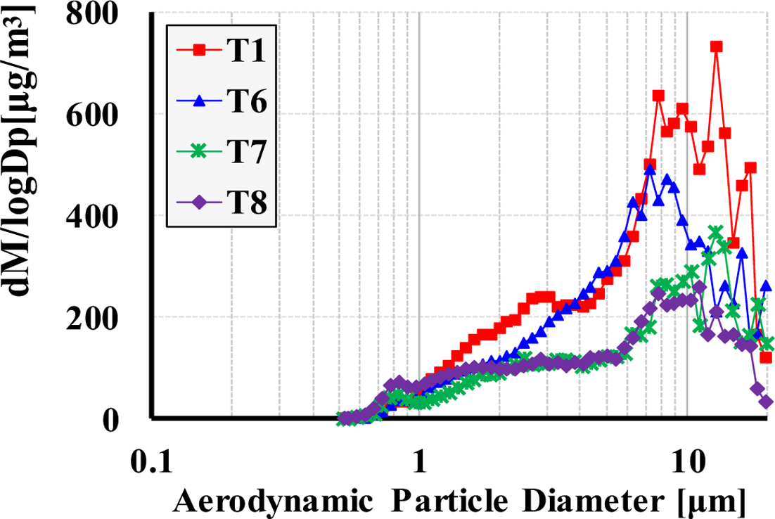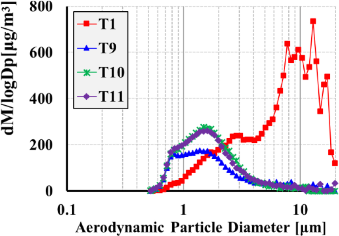 질량 농도 입경 분포도를 각각 Figure 9에 나타내었다. 전체적으로 질량 농도 기준으로는 약 10 μm 부근에서 최대 입경을 나타내었다.