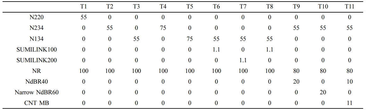 NR에 BR 첨가 및 CNT 적용에 따른 미세먼지 경향을 분석하기 위해 NdBR40과 narrow NdBR60, CNT를 적용하였다. NdBR은 무늬점도 40을 가지는 BR을 의미하고, narrow NdBR60은 무늬점도 60을 가지는 BR을 의미한다. BR 배합에 따른 시편 및 CNT 첨가에 따른 시편을 T9부터 T11로 명명하였다.