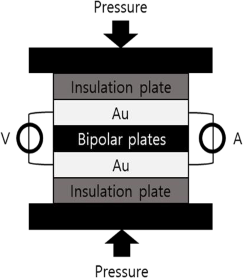 여기서, R4BPsR2BPs는 각각 분리판 4장과 2장에 대한 저항, RAu, RBP는 각각 금 코팅 구리판과 분리판의 벌크 저항, 그리고 RAuIBPRBPIBP는 각각 금 코팅 구리판과 분리판, 분리판과 분리판 사이의 접촉 저항을 나타낸다.