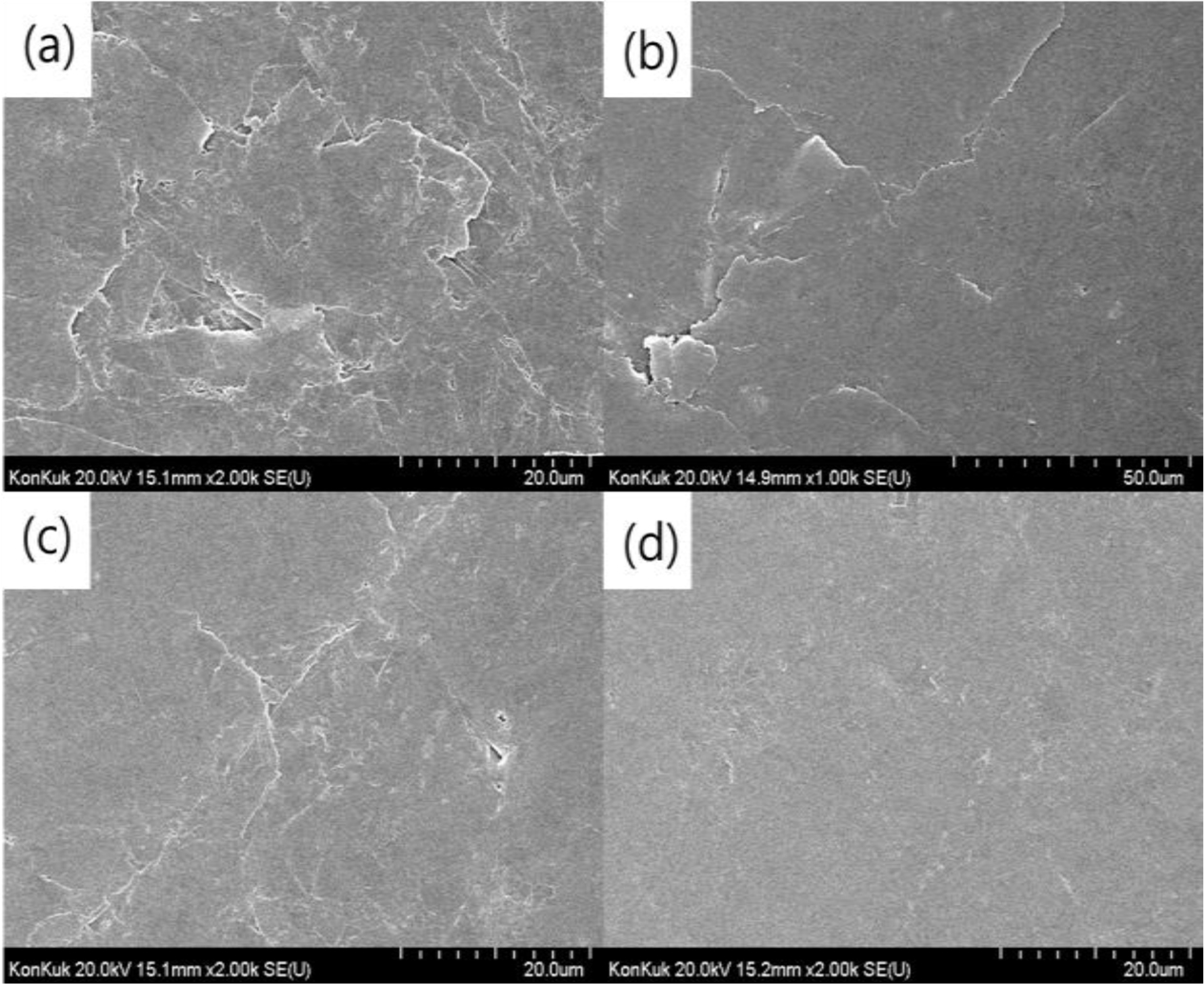 분리판의 표면 분석. PVDF 함량에 따른 분리판의 표면 구조 변화를 확인하기 위해 scanning electron microscope(SEM) 분석을 수행하였으며 그 결과를 Figure 2에 나타내었다. 순수한 팽창 흑연으로 제작된 분리판(Figure 2(a))의 경우 팽창 흑연의 다공성 구조로 인해 생긴 기공들이 연결되어 만들어진 것으로 보이는 크랙들이 표면에 관찰되며 이로 인해 거친 형태의 표면이 관찰되었다. 반면, PVDF가 첨가된 분리판(Figure 2(b), 2(c), 2(d))의 경우 순수한 팽창 흑연 분리판과 비교하였을 때 PVDF 첨가로 인해 팽창 흑연의 다공성 구조로 만들어진 기공들 사이로 PVDF가 함침되어 기공들을 채우기 때문에 크랙이 감소된 것으로 판단된다. 또한 PVDF의 함량이 증가할수록 크랙의 수가 감소하고 표면이 더 밀집되고 평평하게 되었음을 확인할 수 있었다. 이를 확인하기 위해 EDS 원소 분석을 수행하였으며 그 결과를 Figure 3에 나타내었다. EDS 결과에서 보듯이 PVDF가 팽창 흑연 내에 고르게 분산됨을 확인할 수 있었다. 분리판 표면에 형성된 크랙에서는 팽창 흑연의 edge 부분이 쉽게 드러나게 되고 이로 인해 부식이 잘 발생될 것으로 예측되며 표면에 형성된 크랙을 통해 전해질이 쉽게 스며들 것으로 예상된다.