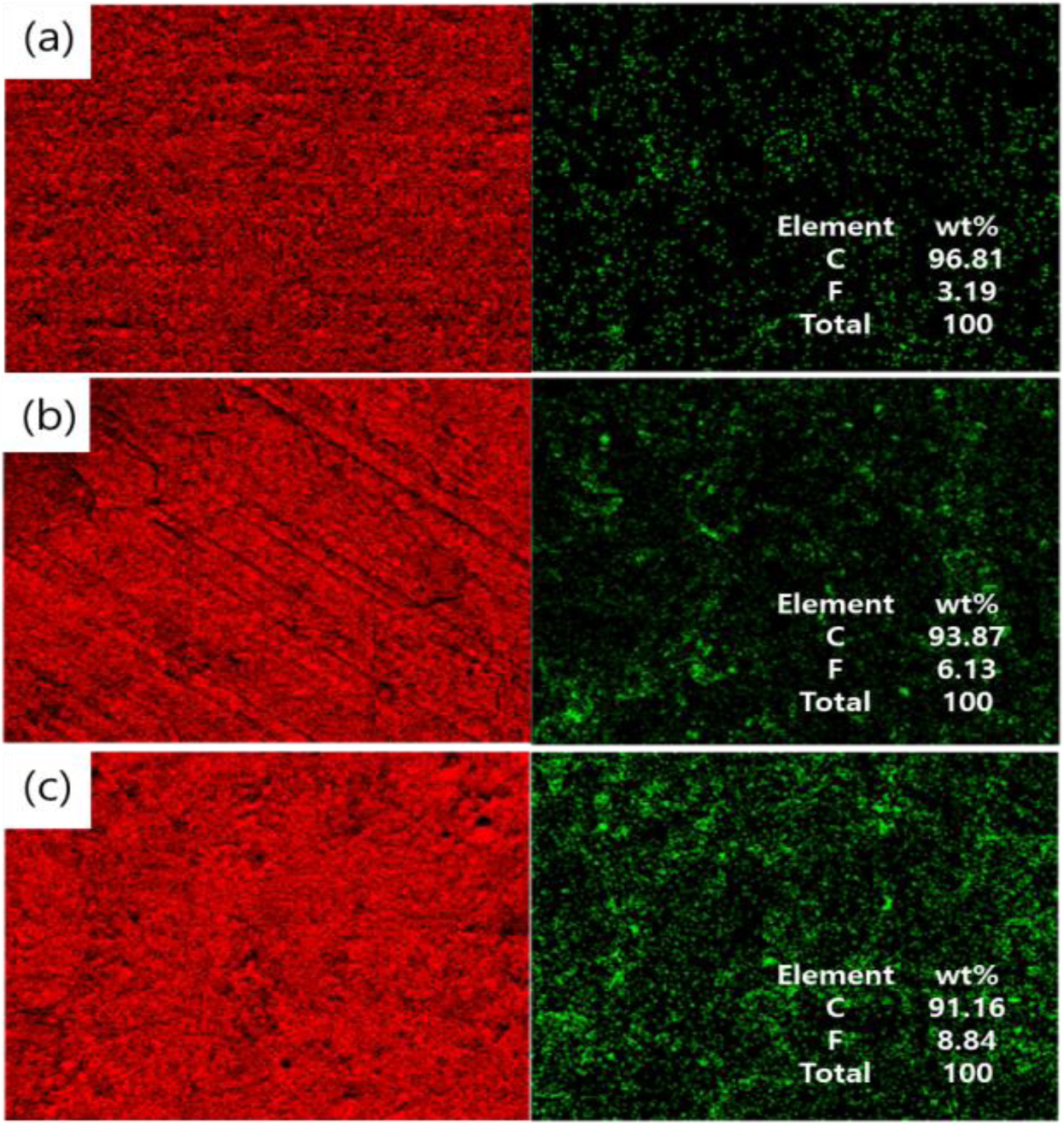 EDS results of (a) 3% PVDF; (b) 6% PVDF; (c) 9% PVDF. Red color indicates carbon and green indicates fluorine.